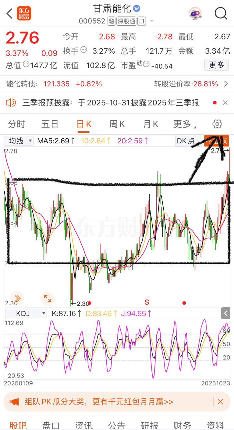 $甘肃能化(SZ000552)$ 今日突破前期箱体,接下来会触碰2.95-3元附近,下午开始入场!