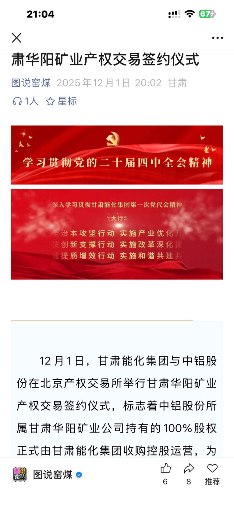 $甘肃能化(SZ000552)$ 12月1日,甘肃能化集团与中铝股份在北京产权交易所举行甘肃华阳矿业产权交易签约仪式,标志着中铝股份所属甘肃华阳矿业公司持有的100%股权正式由甘肃能化集团收购控股运营