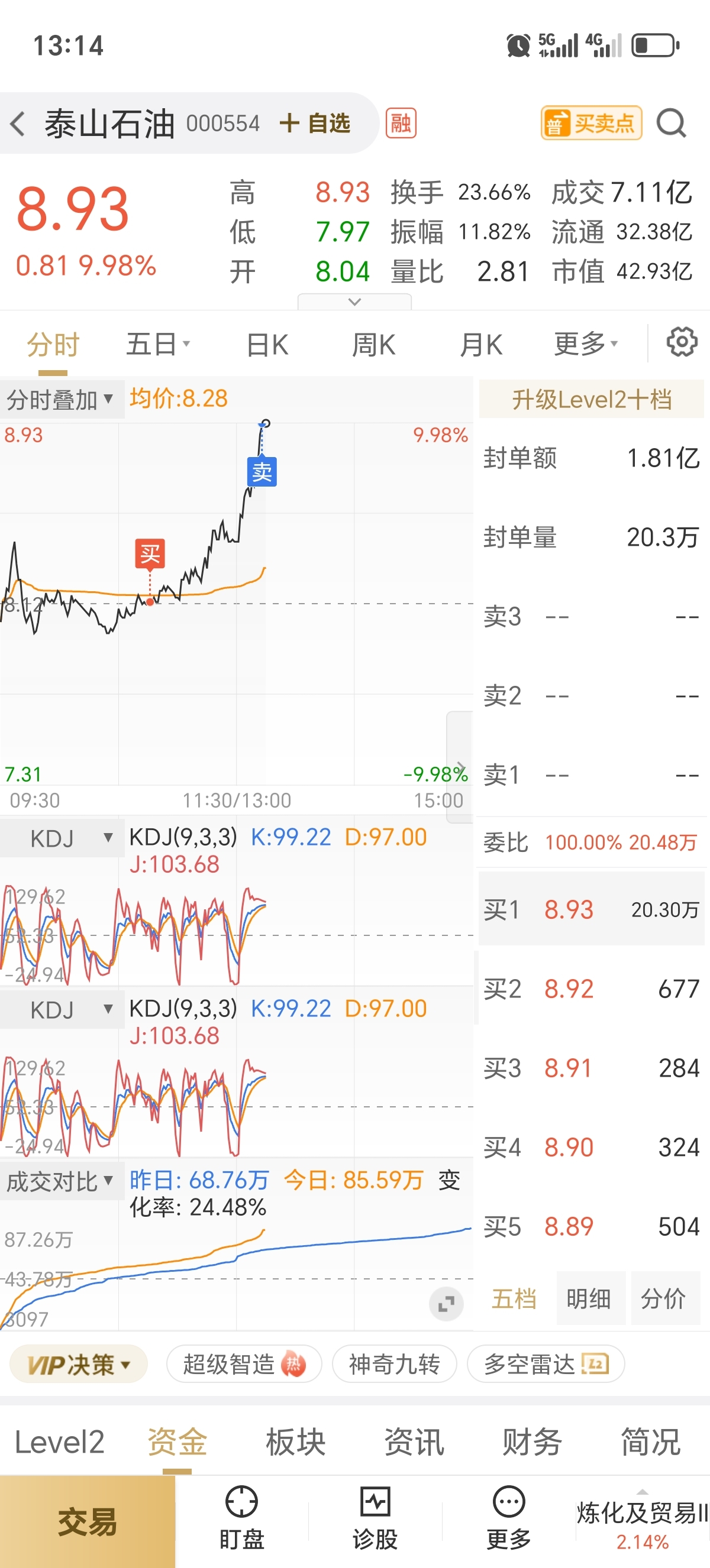 $泰山石油(SZ000554)$ 昨天799买的今天绿到8块犹豫了一下就812了看到通源石油起来了果断补