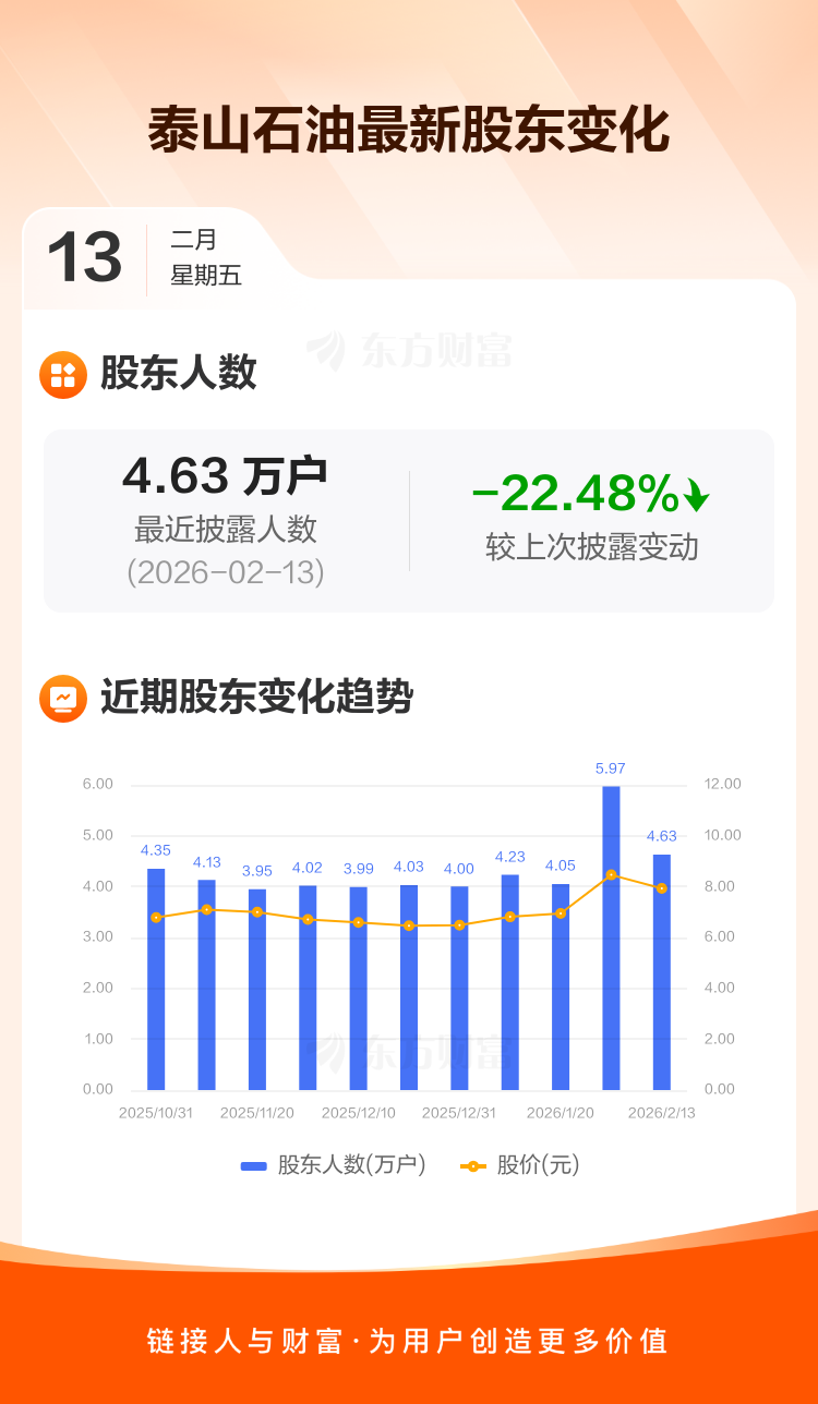 泰山石油:截至2月13日最新股东户数4.63万户,较上期减少22.48%