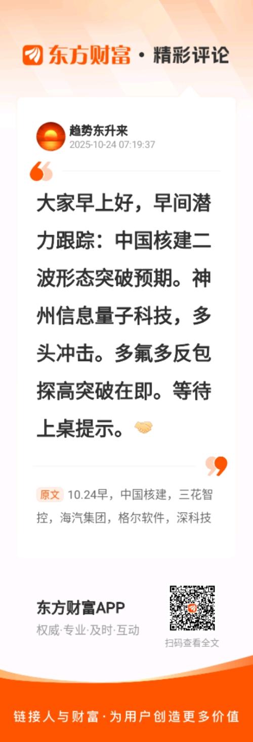 $神州信息(SZ000555)$$格尔软件(SH603232)$$中国核建(SH601611)$//@趋势东升来 :大家早上好,早间潜力跟踪:中国核建二波形态突破预期。神州信息量子科技,多头冲击。多氟多反包探高突破在即。等待上桌提示。