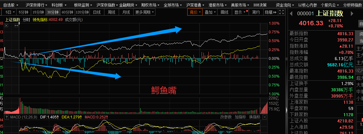 昨天大盘借着M股大涨的东风高开高走,盘中在券商板块的拉升下再次站上4000点,看似强势,但其实暗藏分歧。最明显的就是成交量没跟上,权重股在疯狂表演,中小盘股却没怎么动静,形成了典型的 “鳄鱼嘴” 走势 。今天老k预计会有震荡,多看少动。