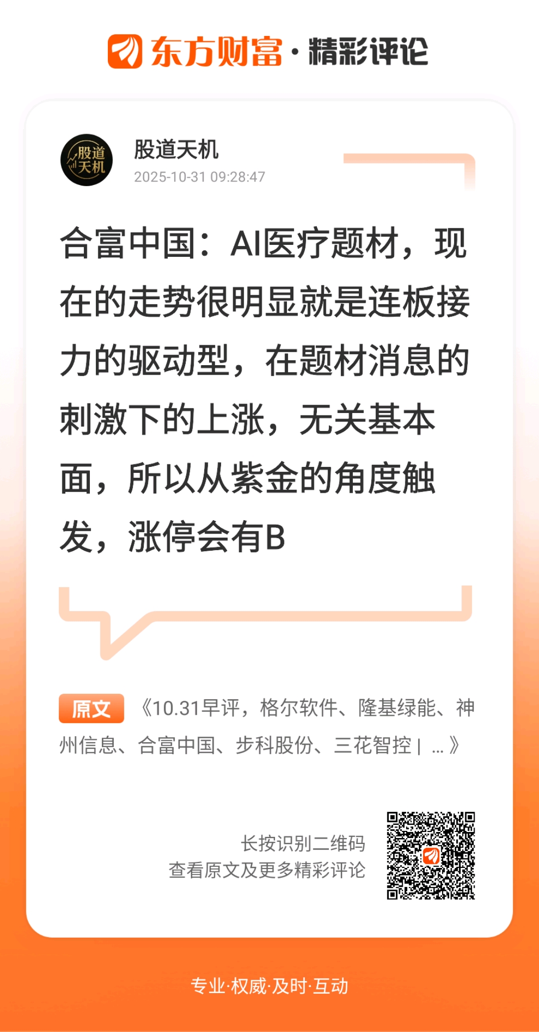 合富中国:昨天个股出现了再次涨停的情况,已经连续三个交易日走出涨停板的动能。主要是从消息面传出,目前公司推出了AI诊断医疗等,已经在跟北京同仁医院等各大医院签订了相应的合作,并且推进科研的商业化成果,另外则是公司目前的各类的手术医学教学智能化平台,已经在大陆本地化生产。所以属于两岸题材的概念,最后则是盘中传出了在医疗方面的相关的传闻的利好,所以受此影响之下,还会有继续上升的动能。当前来说,从技术结构形态比较的简单,目前来讲,周线级别的压制已经被完全突破的情况之下,上方已经没有任何的压力,所以短线的技术结构形态如果过了11。