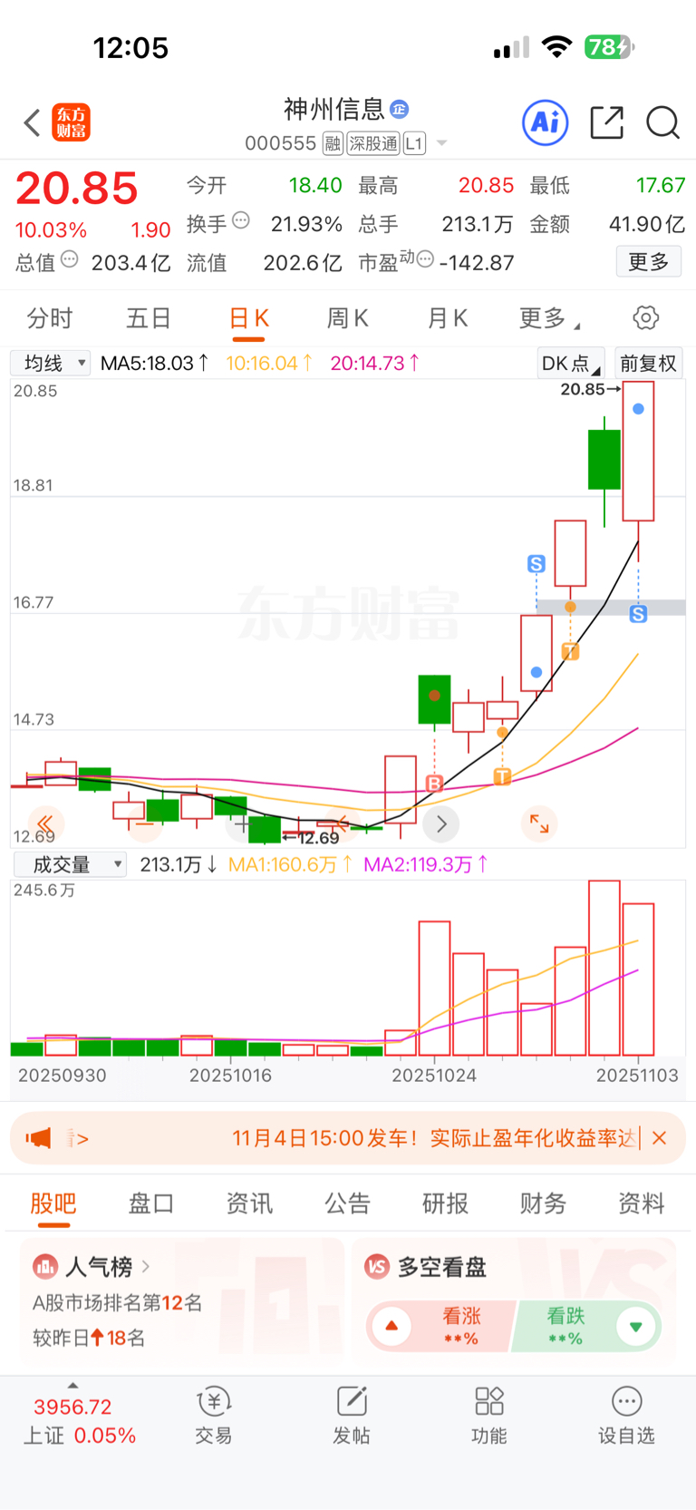 $神州信息(SZ000555)$ 50个点盈利,被洗出来了,继续看好,留下的发财