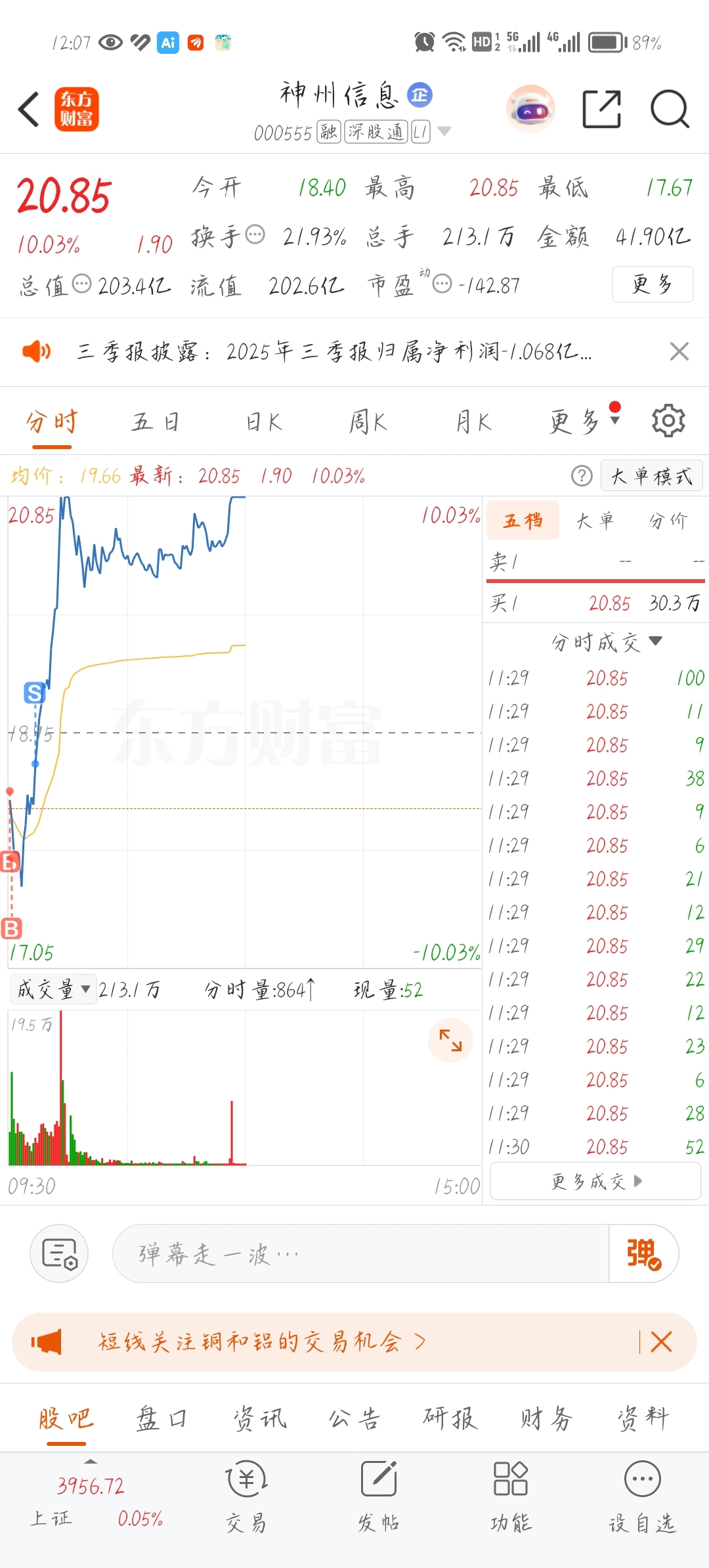 $神州信息(SZ000555)$ 今天买进的好处!就是你卖不掉!保险起见,进二出一!希望明天明天继续!