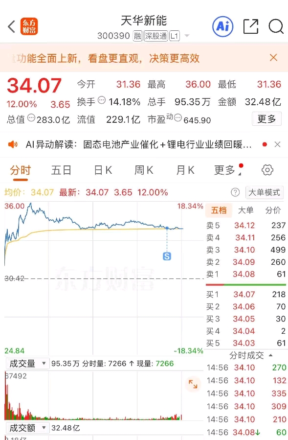$天华新能(SZ300390)$ 今天量能有点大,先减仓一部分,所有缩量调整再加。后面还有空间。