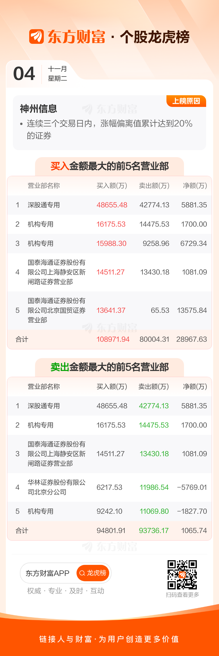 交易所2025年11月4日公布的交易公开信息显示,神州信息因成为日振幅值达到15%的前5只证券、连续三个交易日内,涨幅偏离值累计达到20%的证券上榜。神州信息当日收报21.9元,涨跌幅5.04%,偏离值15.06%,换手率25.97%,成交额53.86亿。异常期间10月31日至11月4日,期间涨幅19.02%,累计偏离值20.25%,区间成交额144.47亿。