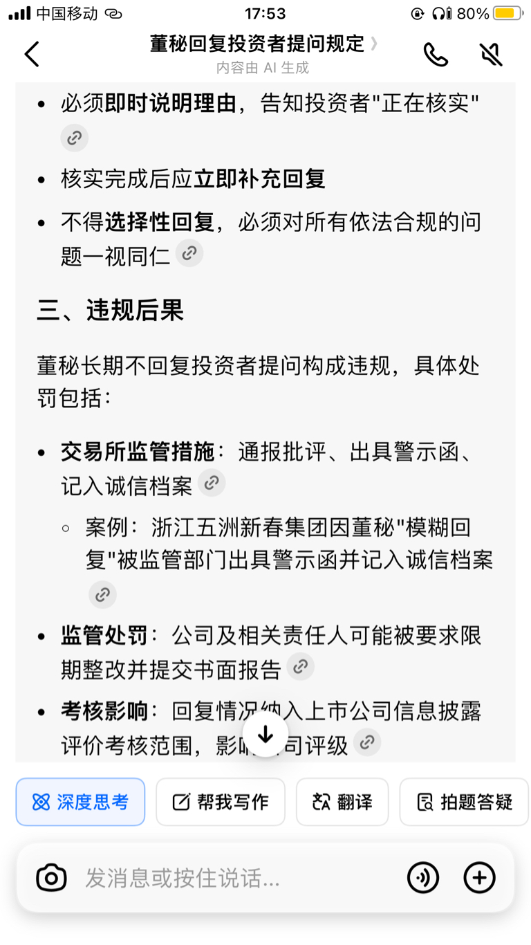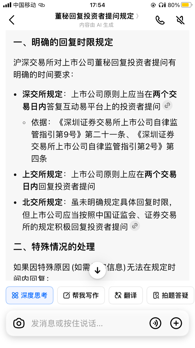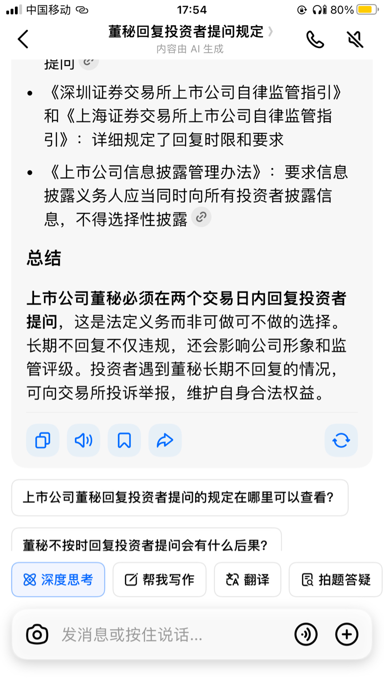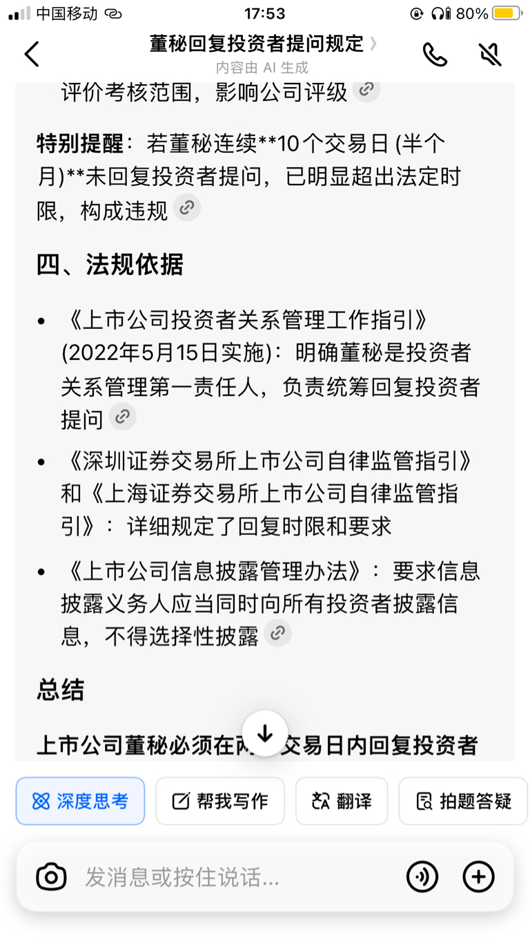 特别提醒:若董秘连续**10个交易日(半个月)**未回复投资者提问,已明显超出法定时限,构成违规