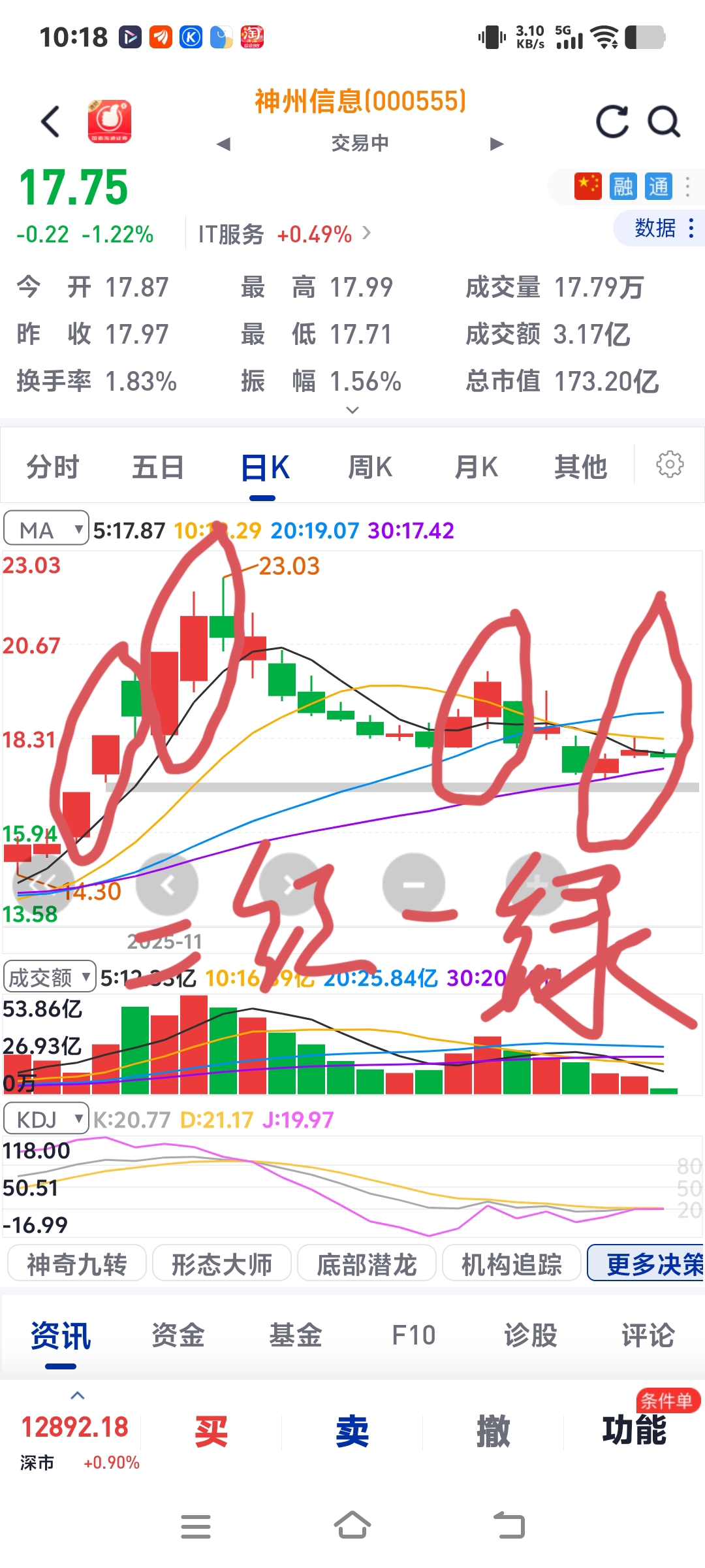 $神州信息(SZ000555)$ 提前下班,大家不要盯盘了,一般情况就是两红一绿。照这个心态就不会太难过。等到收盘来看,或许有意外的惊喜。所以不要抱太大的希望,或许会带来惊喜。看图,下班。