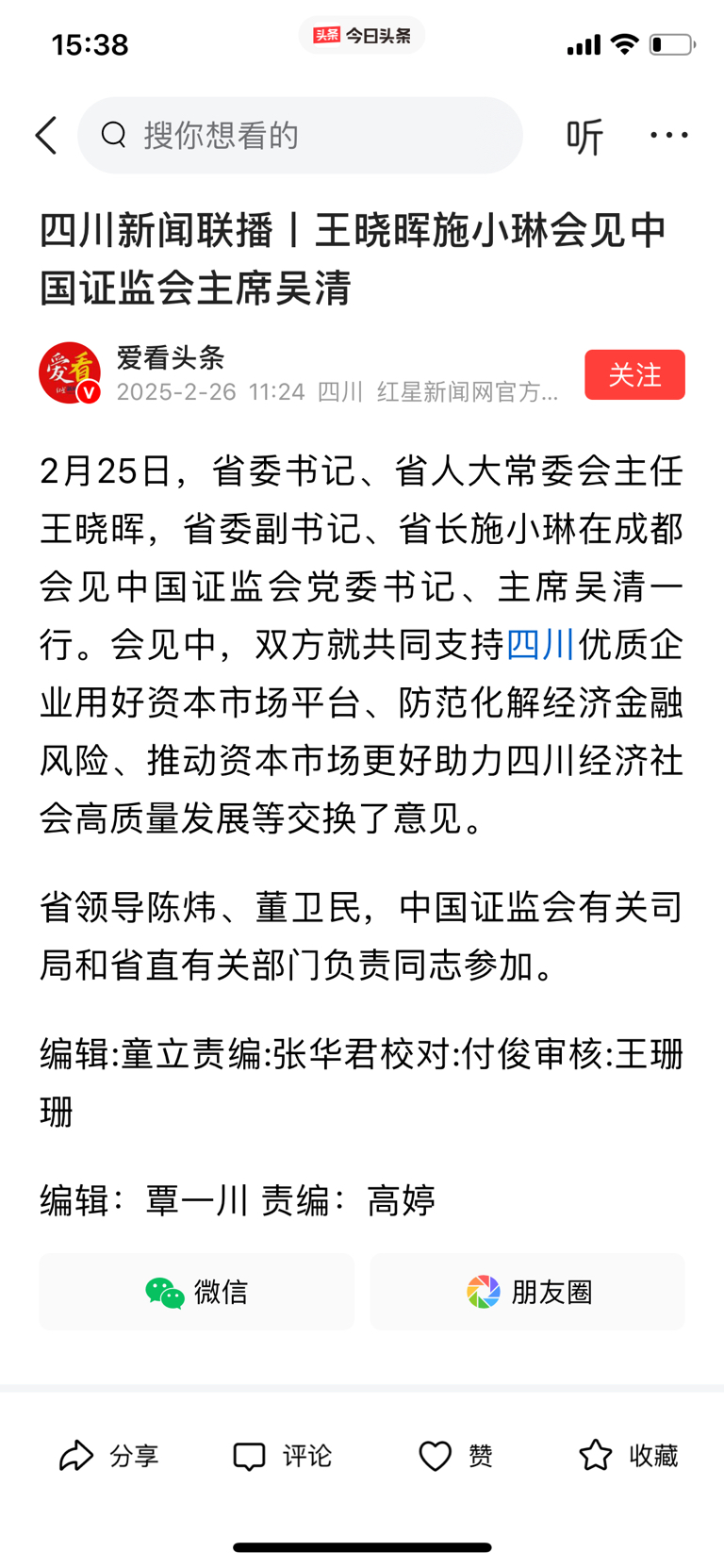 $天府文旅(SZ000558)$ 昨天证监会领导会见四川省委领导,双方就共同支持四川优质企业用好资本市场平台、防范化解经济金融风险、推动资本市场更好助力四川经济社会高质量发展等交换了意见。