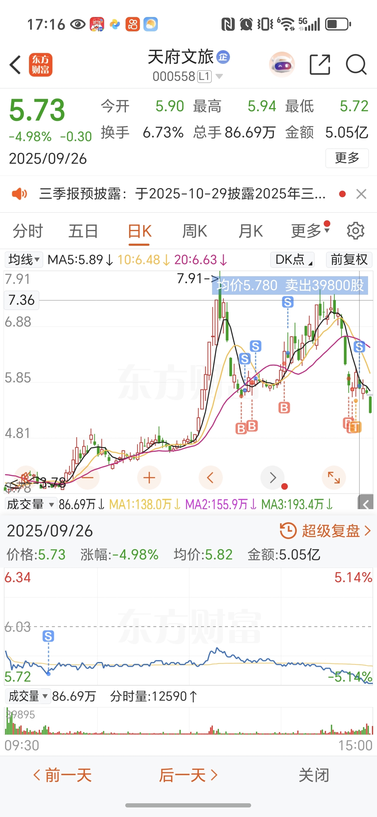 $天府文旅(SZ000558)$ 这一天狠心割肉,不然又被套,明天有低点再来博个反弹就走