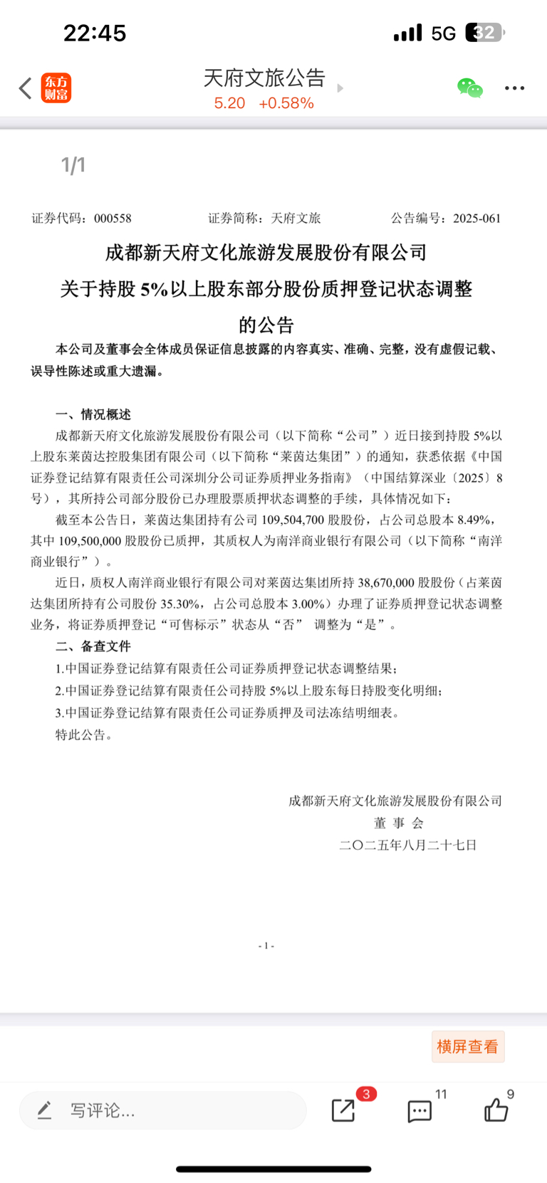 $天府文旅(SZ000558)$ 上次被动减持3个点,这次5个点,等于莱茵达出局了,就看谁来接任二股东,拿住等三季报出来就清楚了