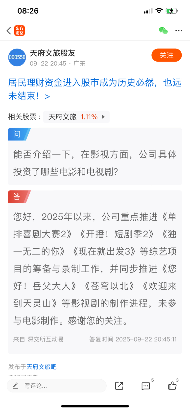 $天府文旅(SZ000558)$ 别再说没参与了,董秘9月份就回复了,资金可以不拉,但你不要造谣。