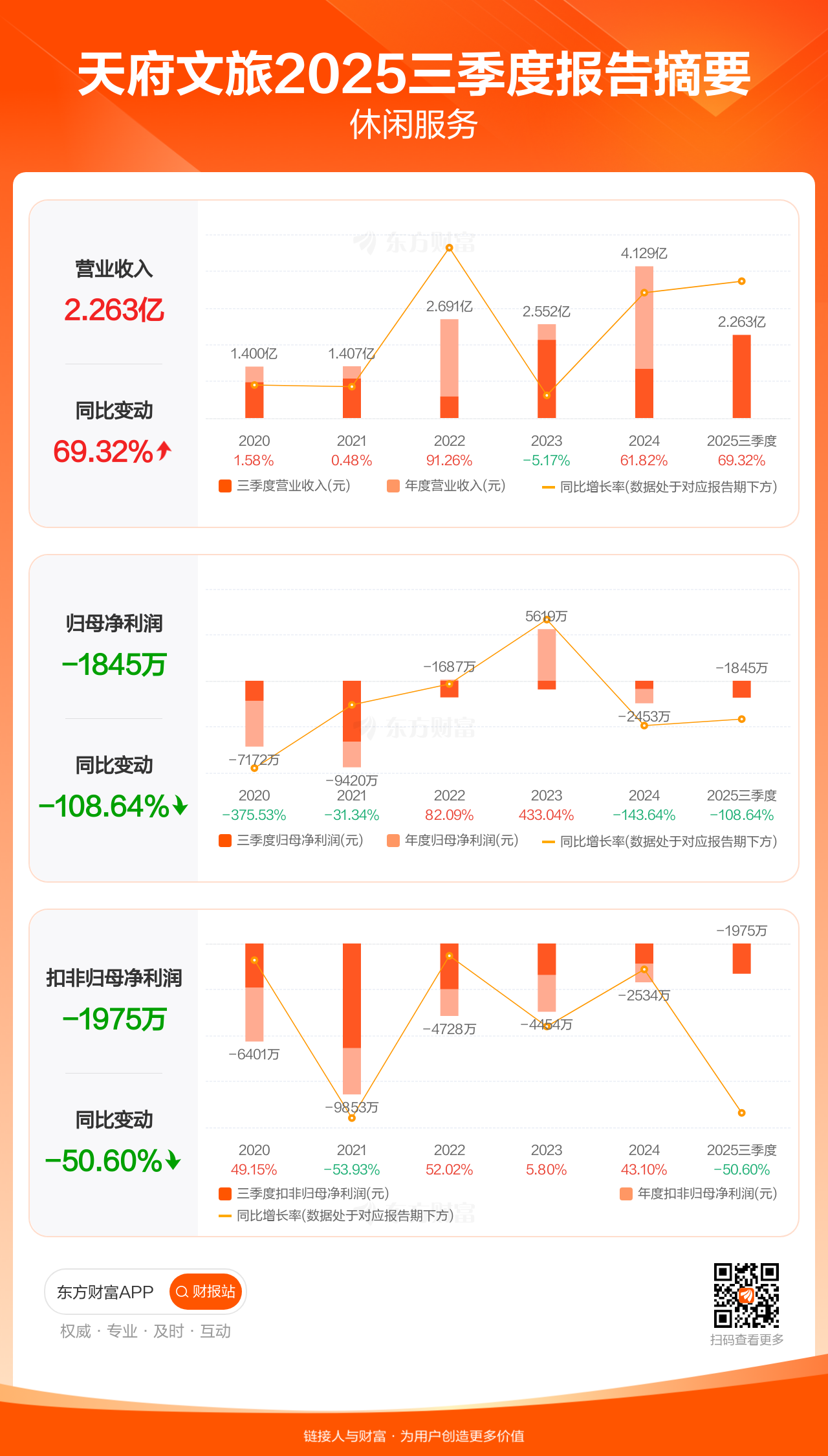 天府文旅10月29日发布2025年三季报显示,公司前三季实现营业收入2.26亿元,同比增长69.32%;归母净利润-1844.79万元;扣非归母净利润-1975.24万元。