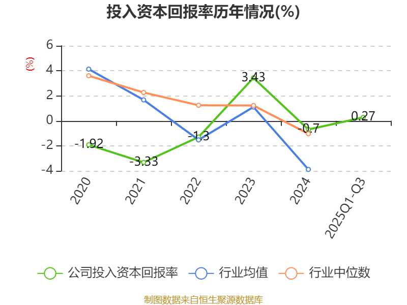 盈利能力方面, 2025年前三季度公司加权平均净资产收益率为-1.75%,同比下降0.93个百分点。公司2025年前三季度投入资本回报率为0.27%,较上年同期上升0.28个百分点。