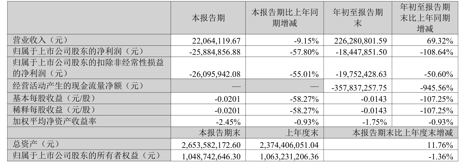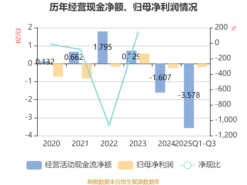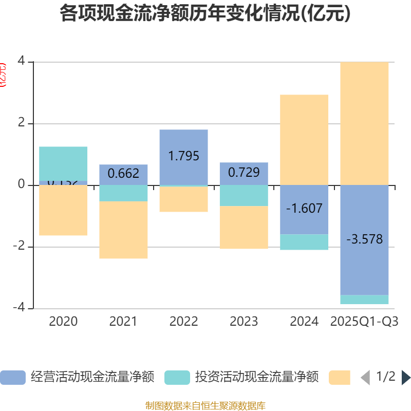 2025年前三季度,公司经营活动现金流净额为-3.58亿元,同比减少3.24亿元;筹资活动现金流净额3.99亿元,同比增加3.08亿元;投资活动现金流净额-2885.03万元,上年同期为-3785.78万元。