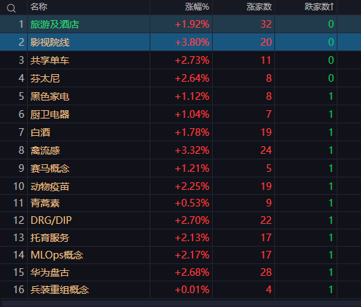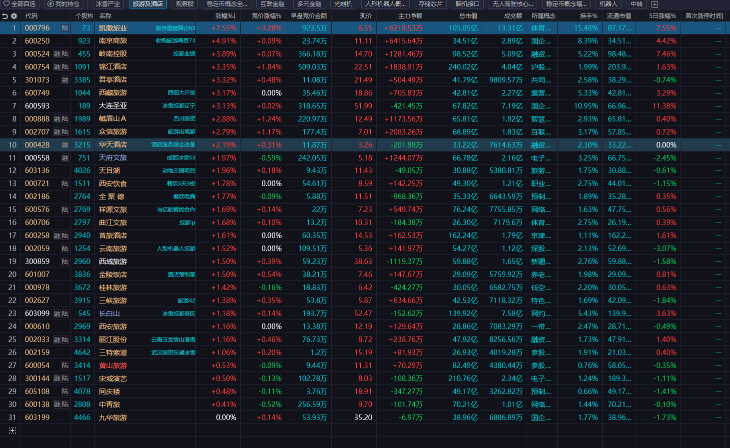 全市场共有四个板块是全红的,没有绿盘的,旅游及酒店排名第一
