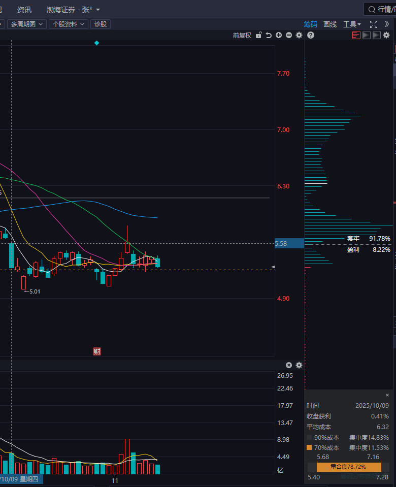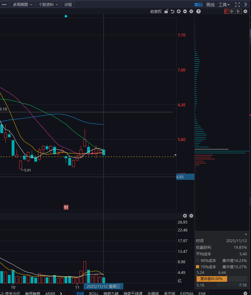 10月10日,持仓成本在5.5元以上的占比89.62%,到今天,持仓5.5元以上的占比40.32%。也就是说,在最近一个多月的横盘震荡中,有49.30%的筹码无法忍受如此行情,选择割肉离场了。当然这个数据肯定有出入,但是至少有35%以上的高位筹码割肉离场了,因为搁谁谁也无法忍受遥遥无期的套牢!套住30%的基本不用打开电脑看!