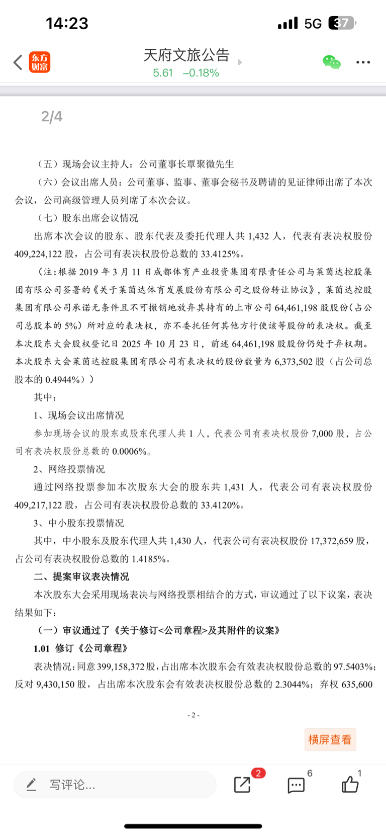 $天府文旅(SZ000558)$ 懂得人来聊聊,网络投票1431人,其中1430人持有1700万股,那一个大户就持有3.9亿股,占总数的32%,十大股东没有这个数量,说明控股股东增持了吗?