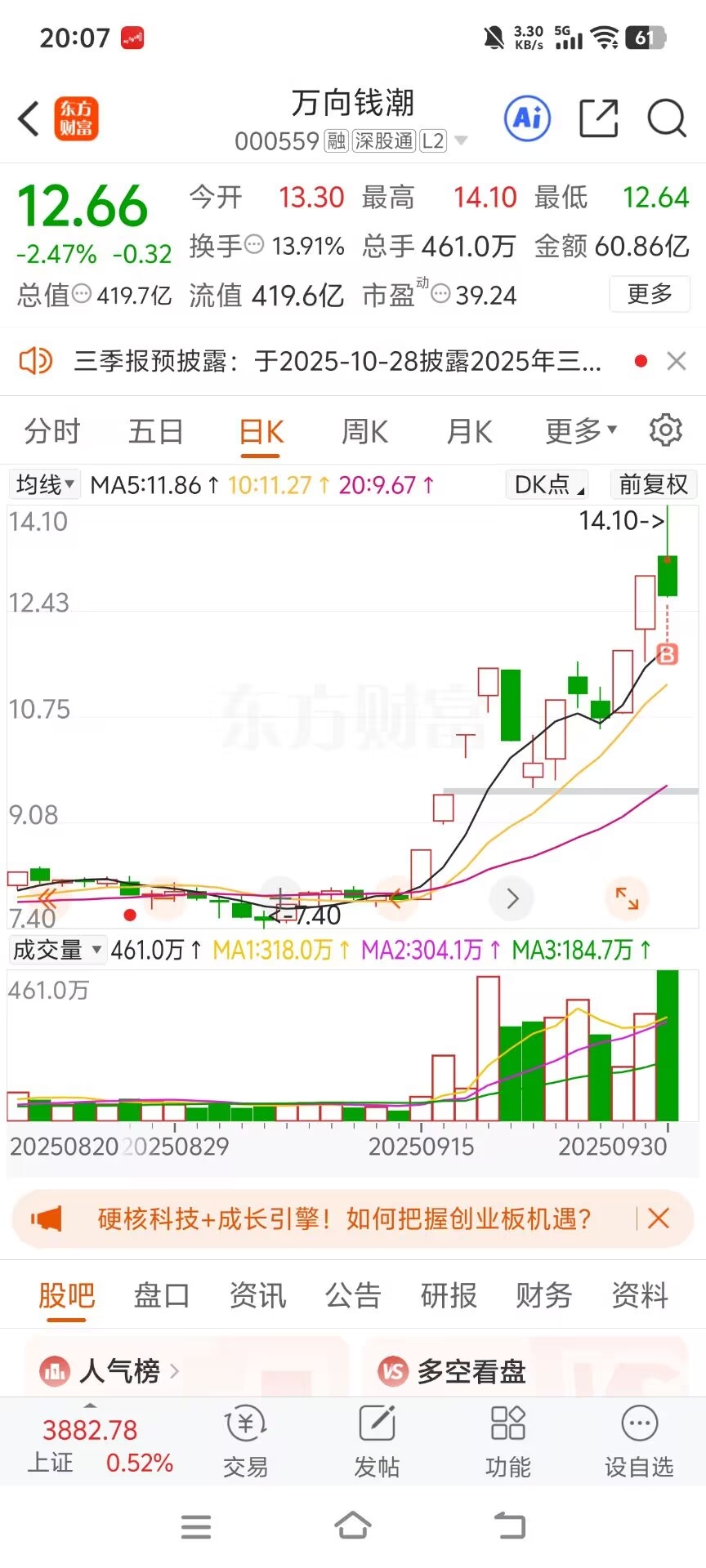 $万向钱潮(SZ000559)$ 今天尾盘的票,没想到12.7都成交了,低吸了两笔,期待节后冲高的表现!