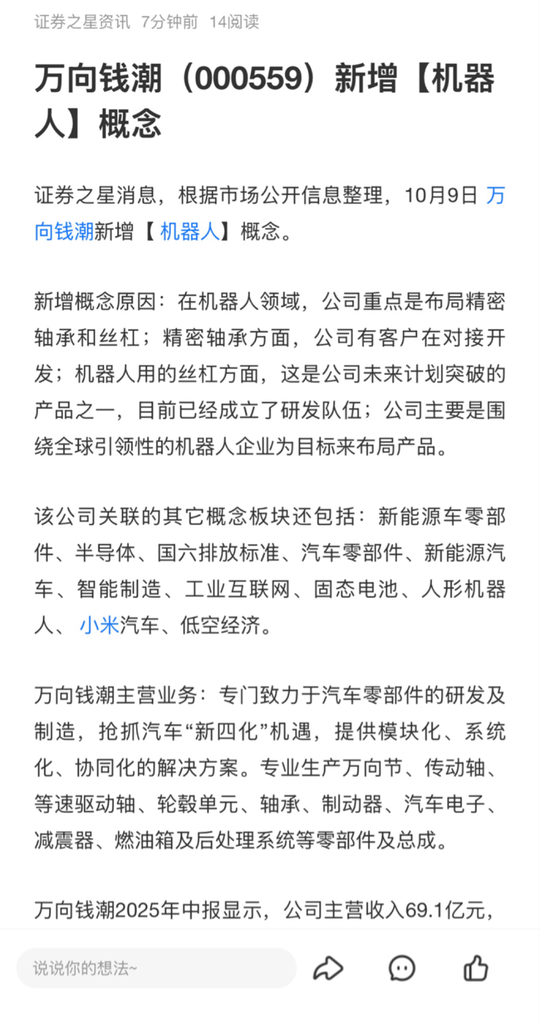 $万向钱潮(SZ000559)$ 不是本来就有机器人概念吗。
