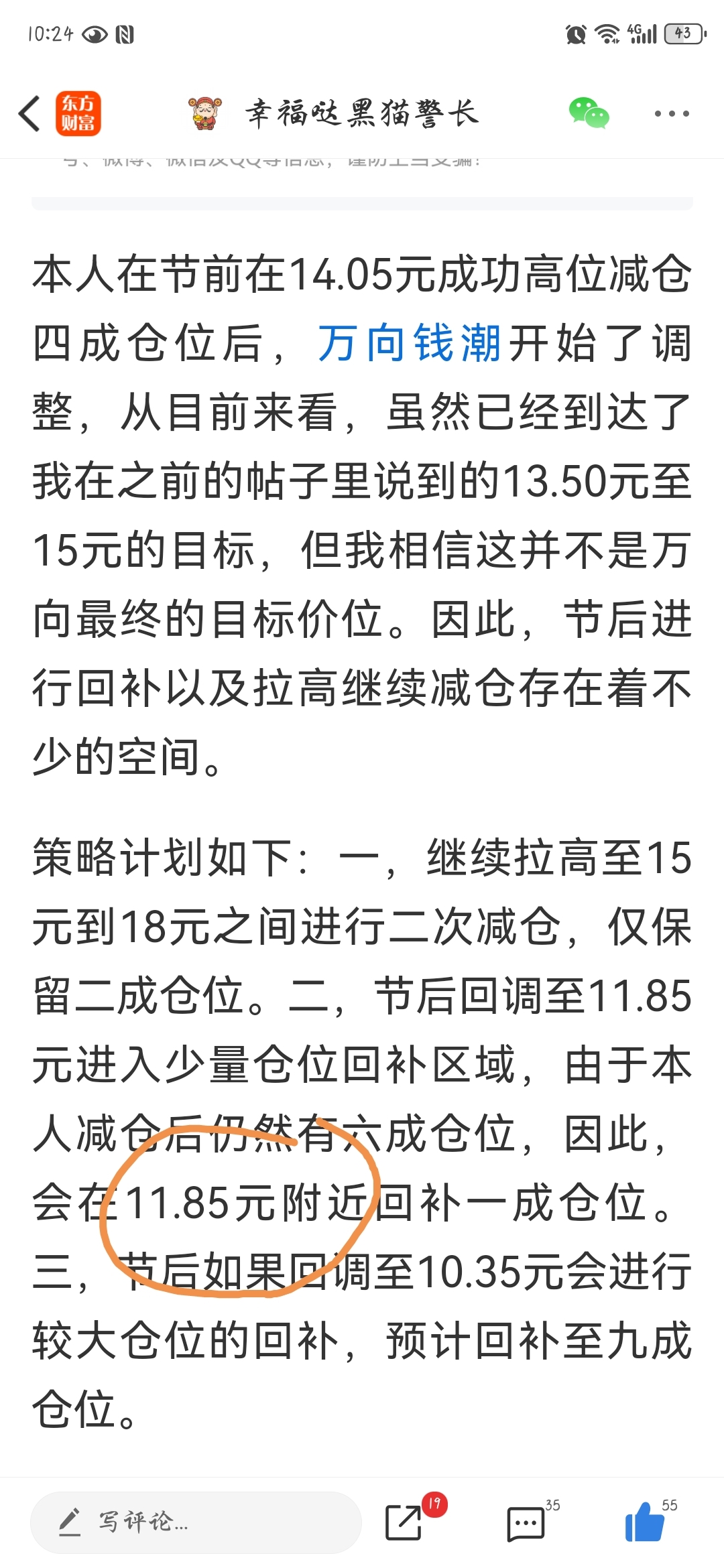 继续知行合一!本人在节前14.05元减仓后,预计万向钱潮短期调整位置在11.85元附近,这只能回补一部分仓位。今天本人在11.91元进行了回补一成仓位,其余资金如果见到10.35元附近就会大仓位回补。