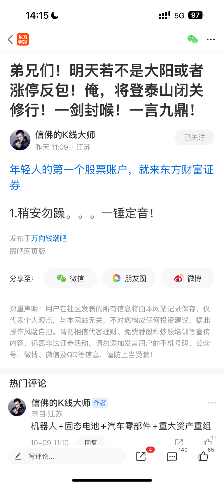 温馨提示: 1.根据《证券法》规定,禁止编造、传播虚假信息或者误导性信息,扰乱证券市场;2.用户在本社区发表的所有资料、言论等仅代表个人观点,与本网站立场无关,不对您构成任何投资建议。用户应基于自己的独立判断,自行决定证券投资并承担相应风险。《东方财富社区管理规定》