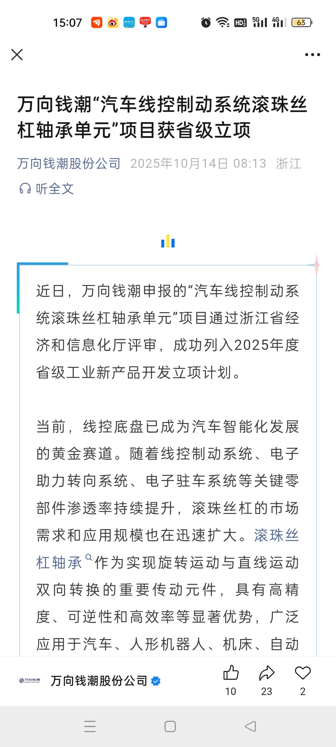 $万向钱潮(SZ000559)$ 丝杆获省级立项,将获得省政府资金与科技部门的大力支持项目。