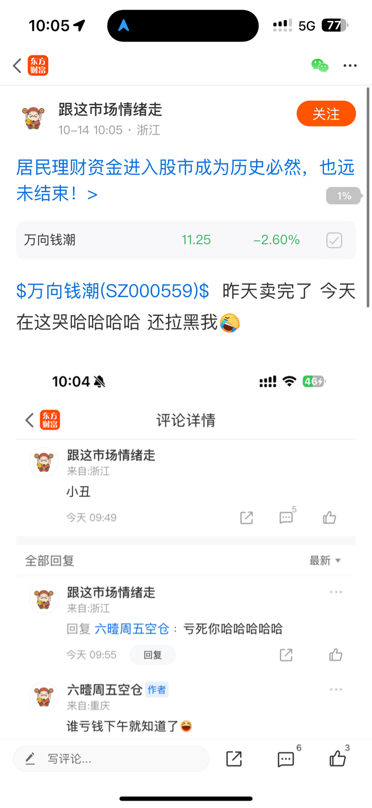 $万向钱潮(SZ000559)$ 这种人劝都不配 不带逻辑骂人 不懂他靠啥底气在这里叫 不想救了 直接删帖 从陈小群进来的第二天一直在劝退 一堆人在这里骂 股恶心 里面的人也这样 真服了
