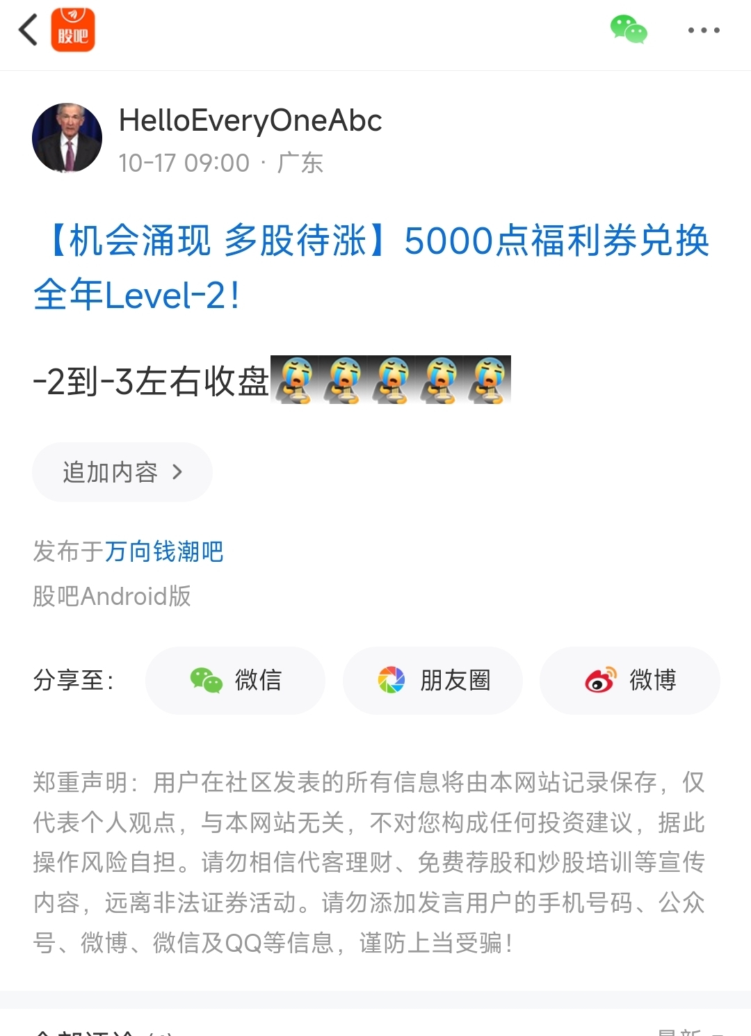 温馨提示: 1.根据《证券法》规定,禁止编造、传播虚假信息或者误导性信息,扰乱证券市场;2.用户在本社区发表的所有资料、言论等仅代表个人观点,与本网站立场无关,不对您构成任何投资建议。用户应基于自己的独立判断,自行决定证券投资并承担相应风险。《东方财富社区管理规定》