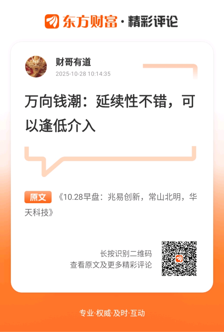 $常山北明(SZ000158)$:昨天走势则在震荡中透着韧性。早盘开盘后便在高位整理,虽未像兆易创新那般凌厉上涨,但始终稳中有升。前期连续多日的调整让市场情绪仍显谨慎。盘中波动时,想到它即将披露三季报,期待业绩能给出惊喜,又担心短期趋势未完全扭转。今日大概率会延续震荡格局,若三季报业绩超预期,或能借国产替代热度突破近期压力位,若业绩平淡,可能仍需在当前区间整理,需重点关注基本面信号与板块情绪的共振情况。