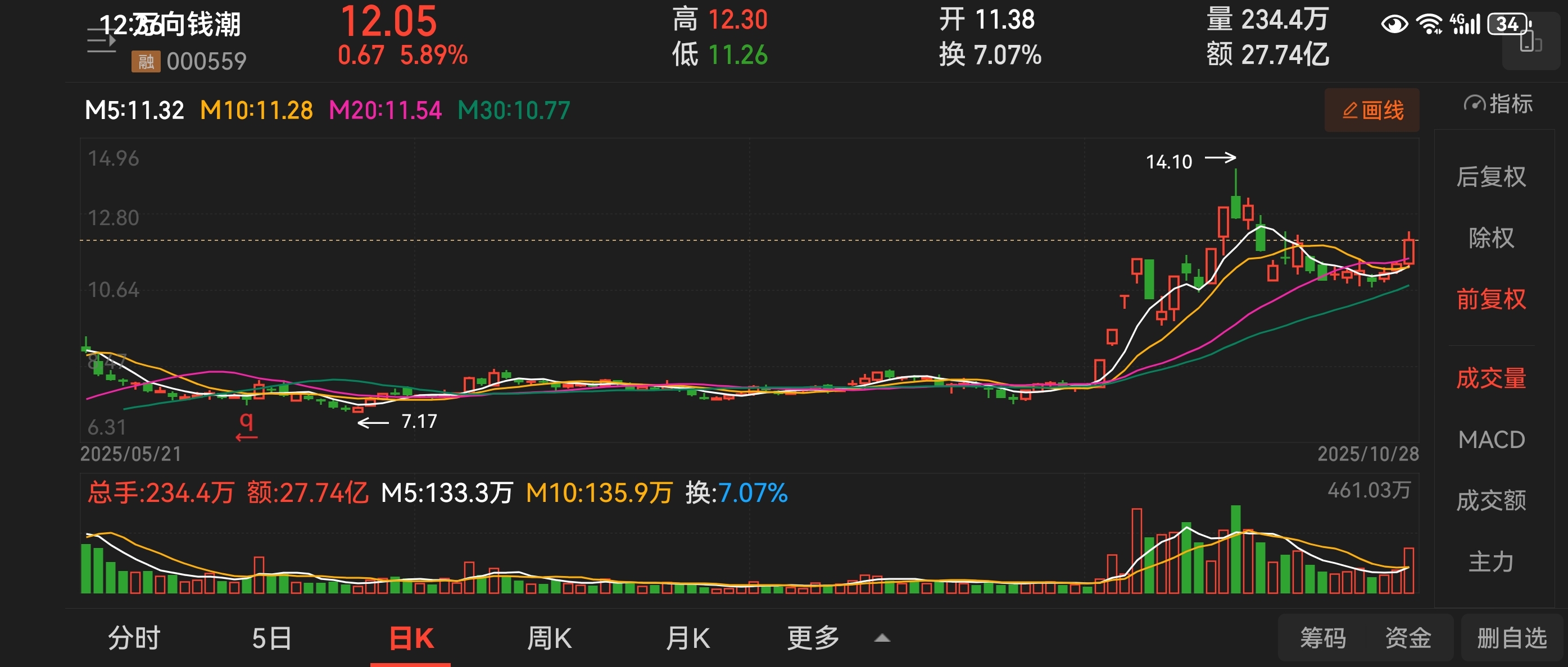 $万向钱潮(SZ000559)$ 今天大概率高开收绿!标准的红三兵加一阴,不过后续还是看突破14