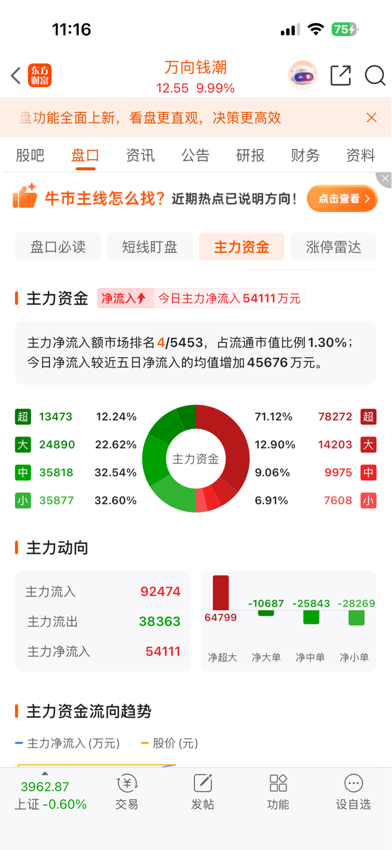 $万向钱潮(SZ000559)$ 主力一直在净流入