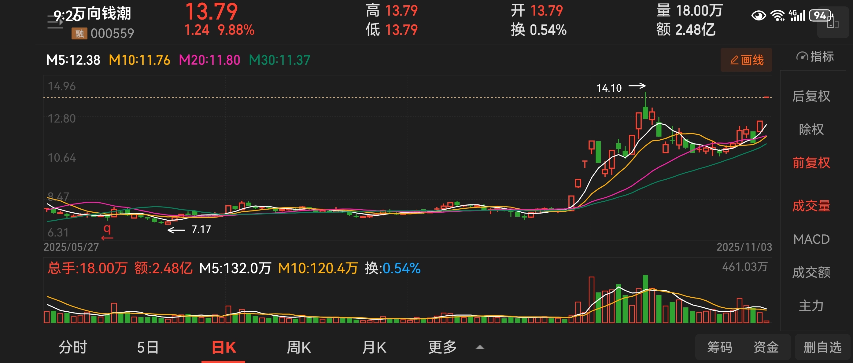 $万向钱潮(SZ000559)$ 29号分享的,看能否突破14