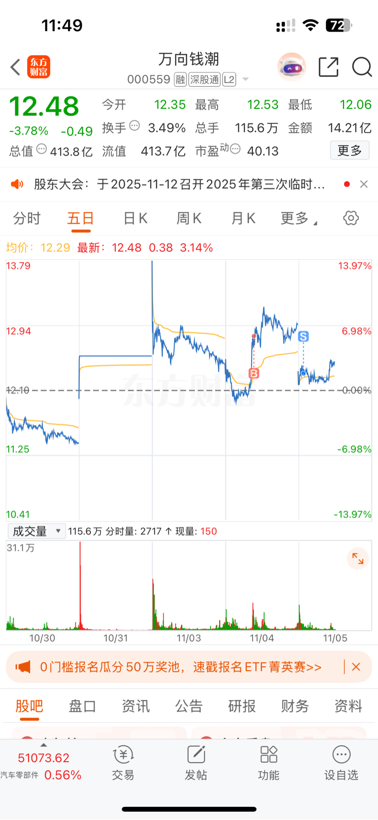 $万向钱潮(SZ000559)$ 昨天追入、吃了长面条溜了