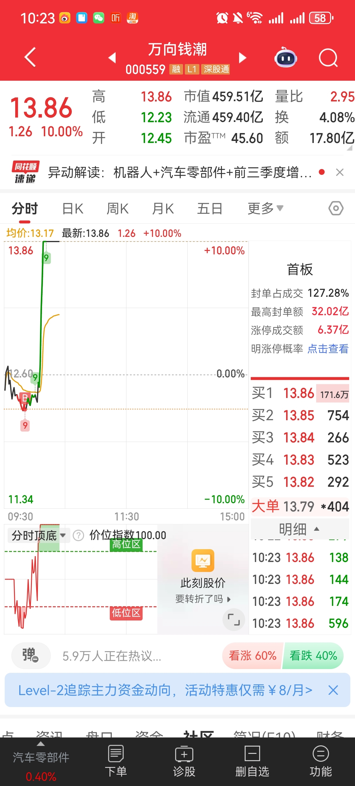 $万向钱潮(SZ000559)$ 看了三天了,早上水下12.27建仓