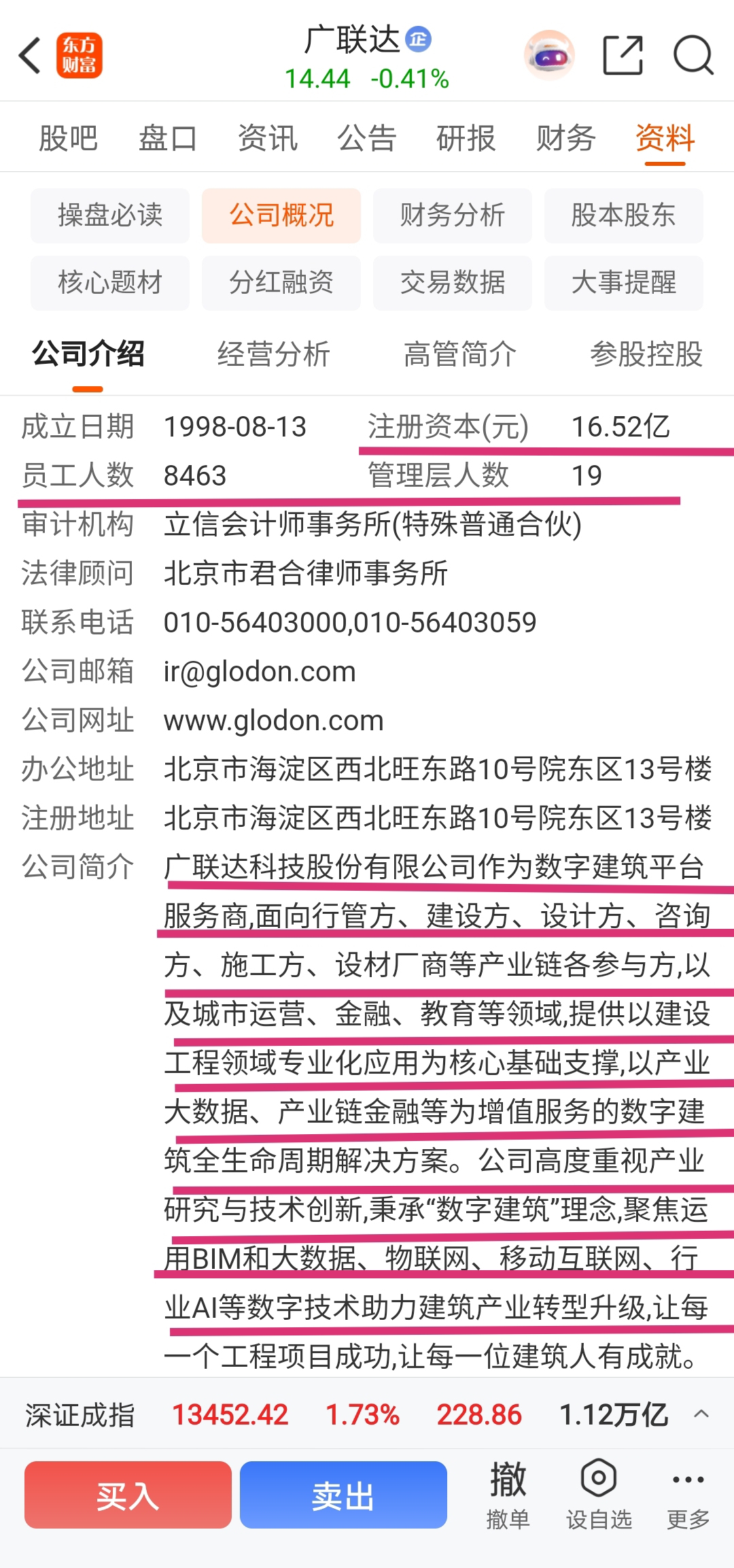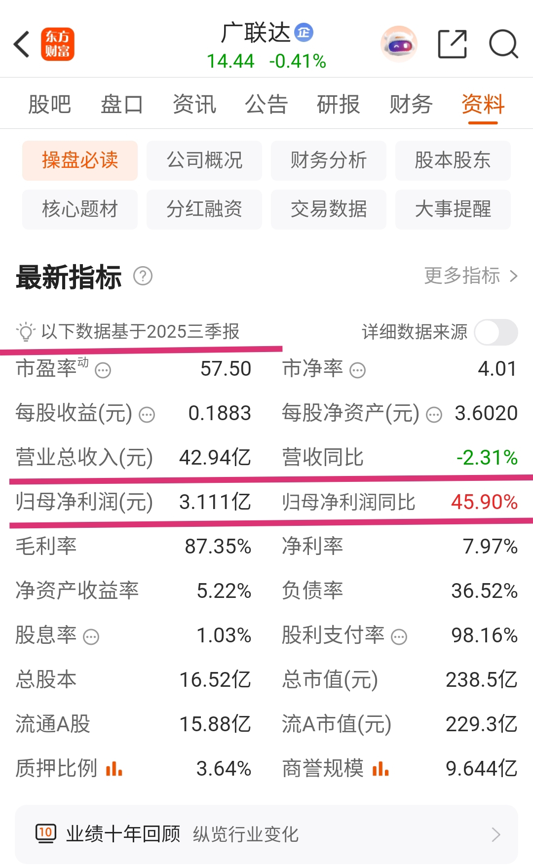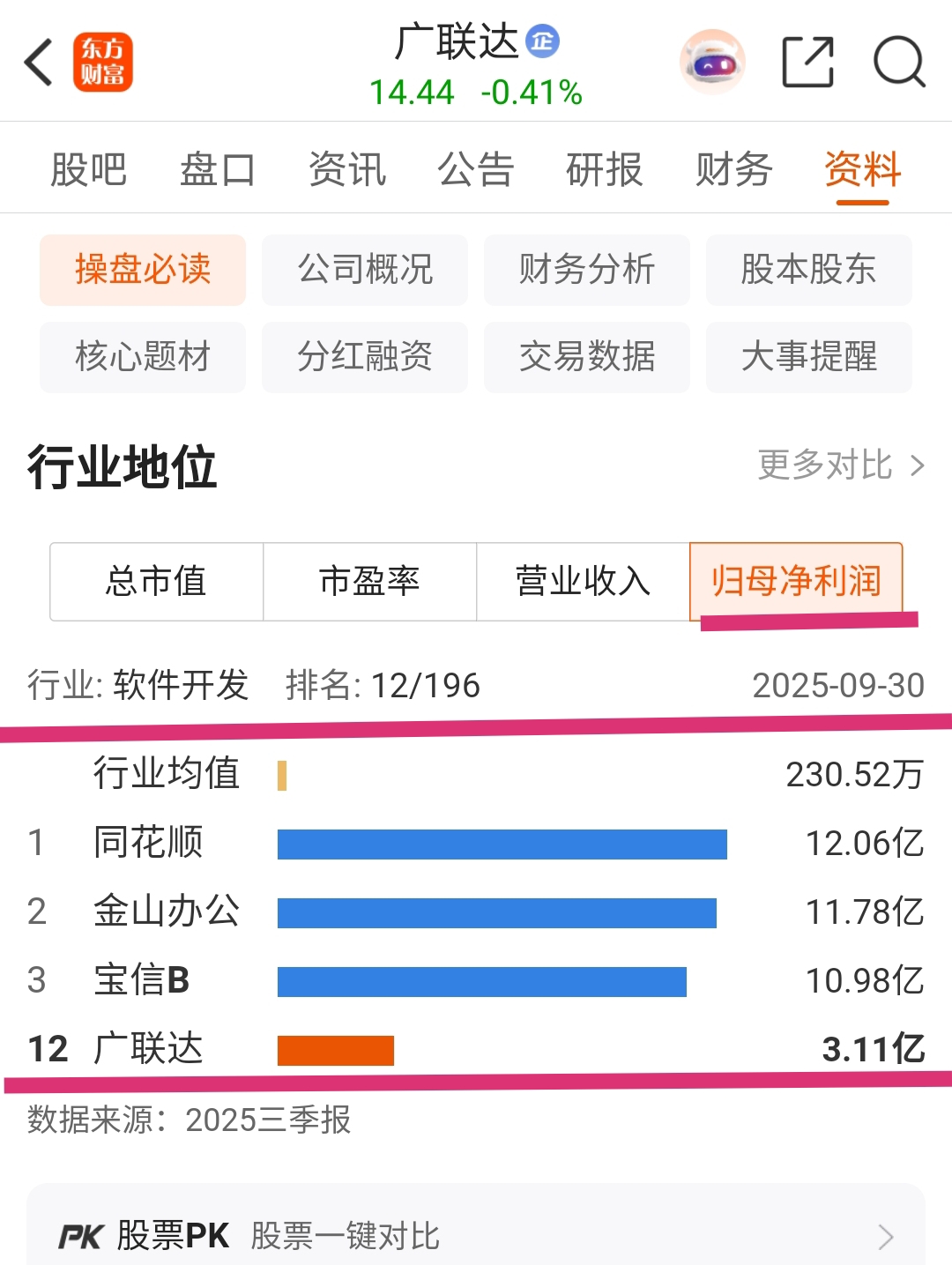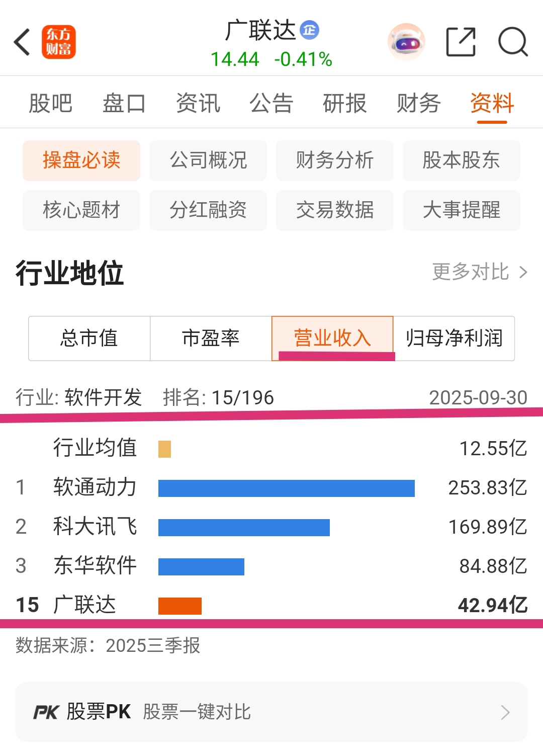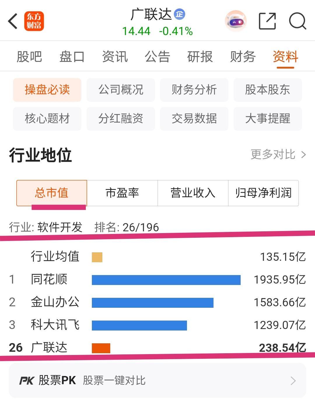 2025年11月6日广联达总市值238.54亿元,行业排位为26/196(2025年11月6日收盘股价14.44元/股)。