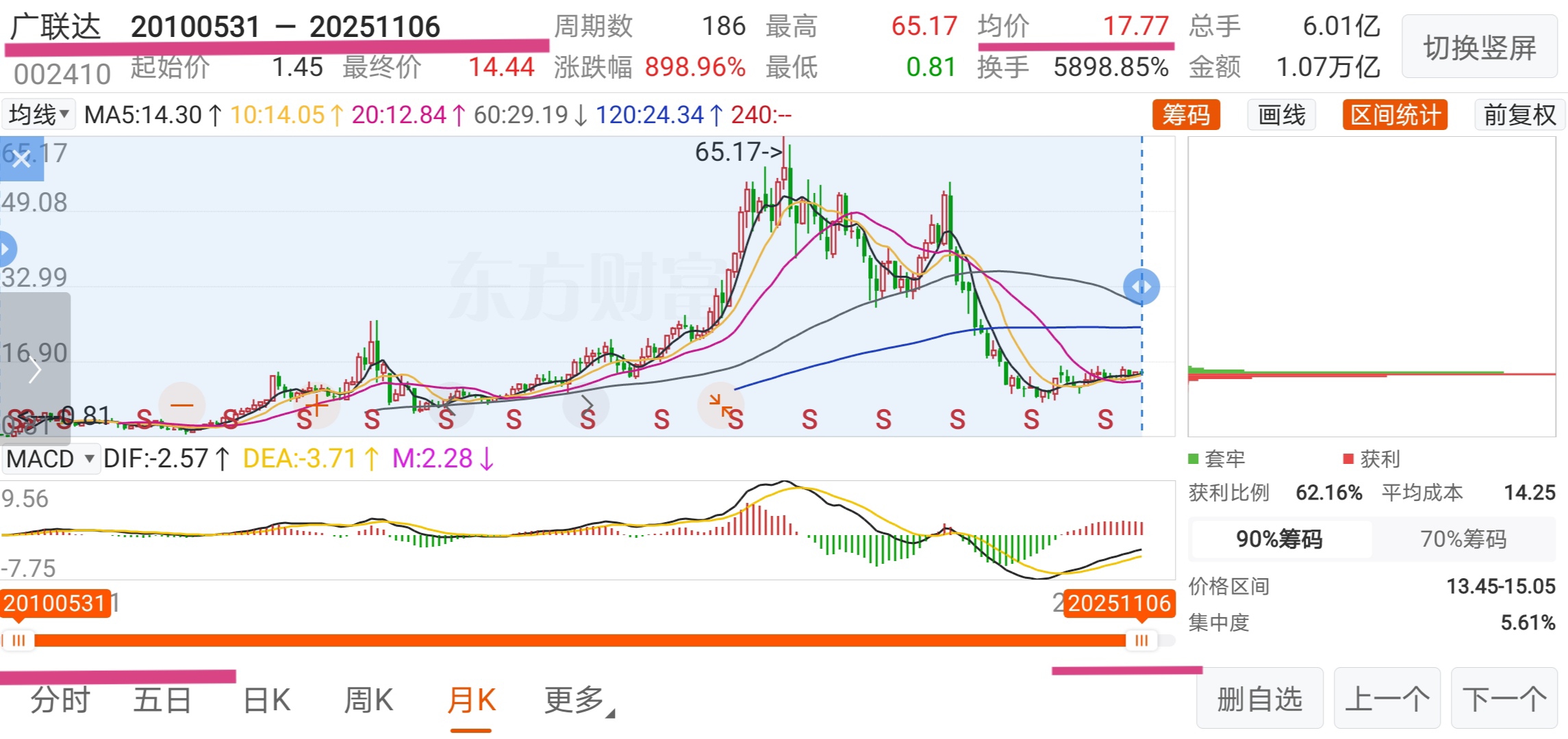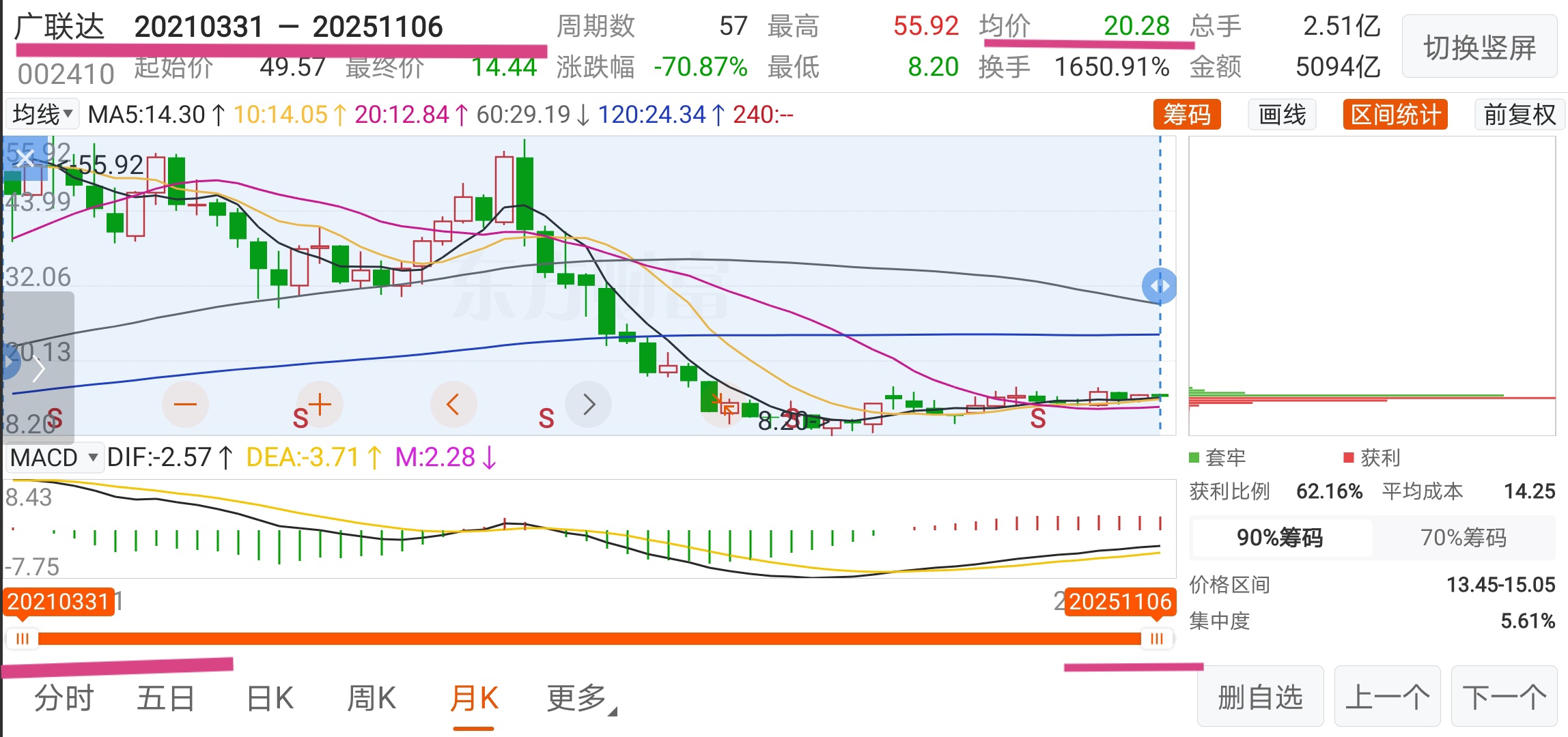 广联达从2021年3月至今约四年半运行均价20.28元/股。现股价14.44元/股(总市值238.54亿元)。