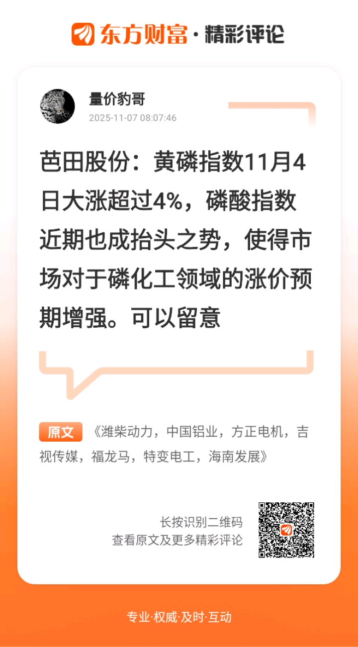 //@量价豹哥 :芭田股份:黄磷指数11月4日大涨超过4%,磷酸指数近期也成抬头之势,使得市场对于磷化工领域的涨价预期增强。可以留意 $万向钱潮(SZ000559)$$中国西电(SH601179)$$中国铝业(SH601600)$