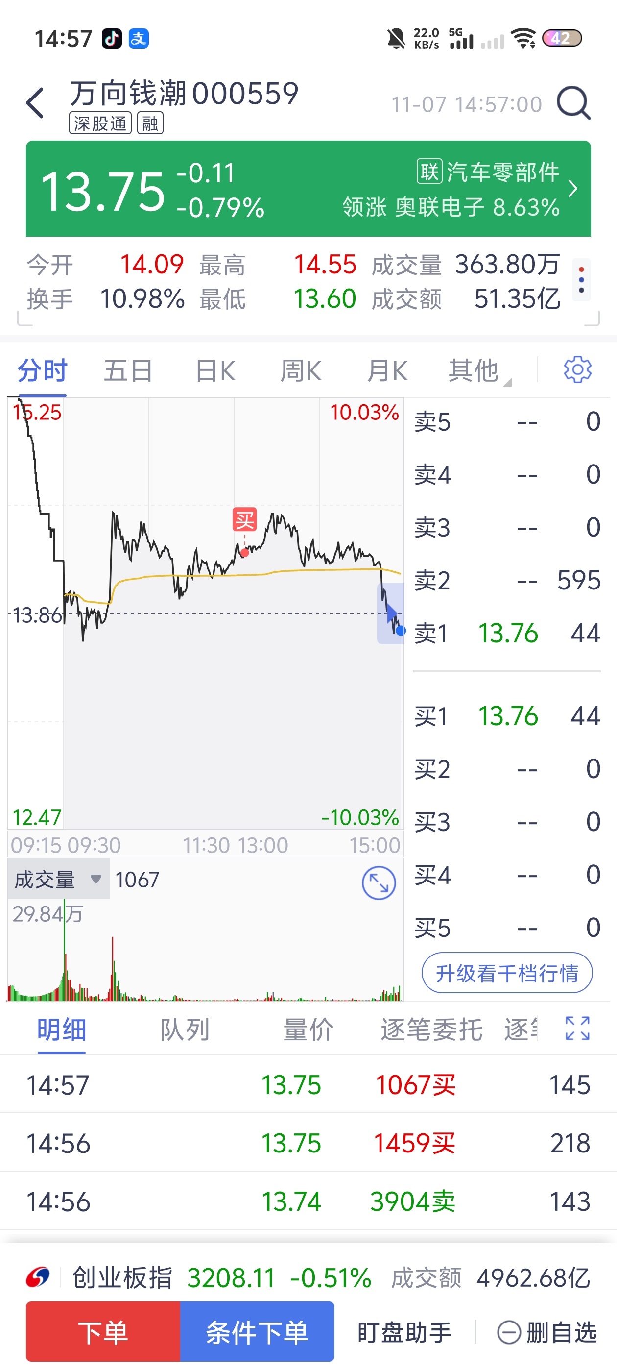 $万向钱潮(SZ000559)$ 买了2手 都能让我亏50 饭钱都没有了!主力你太狠了