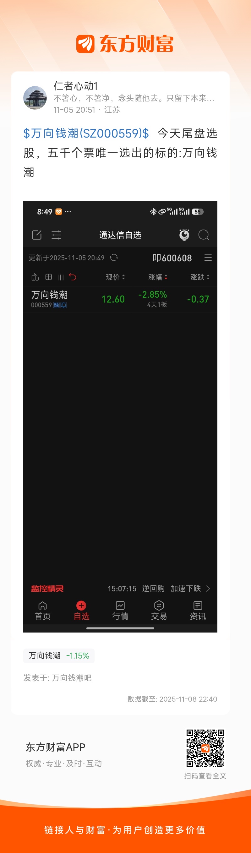 $万向钱潮(SZ000559)$  今天尾盘选股,五千个票唯一选出的标的:万向钱潮