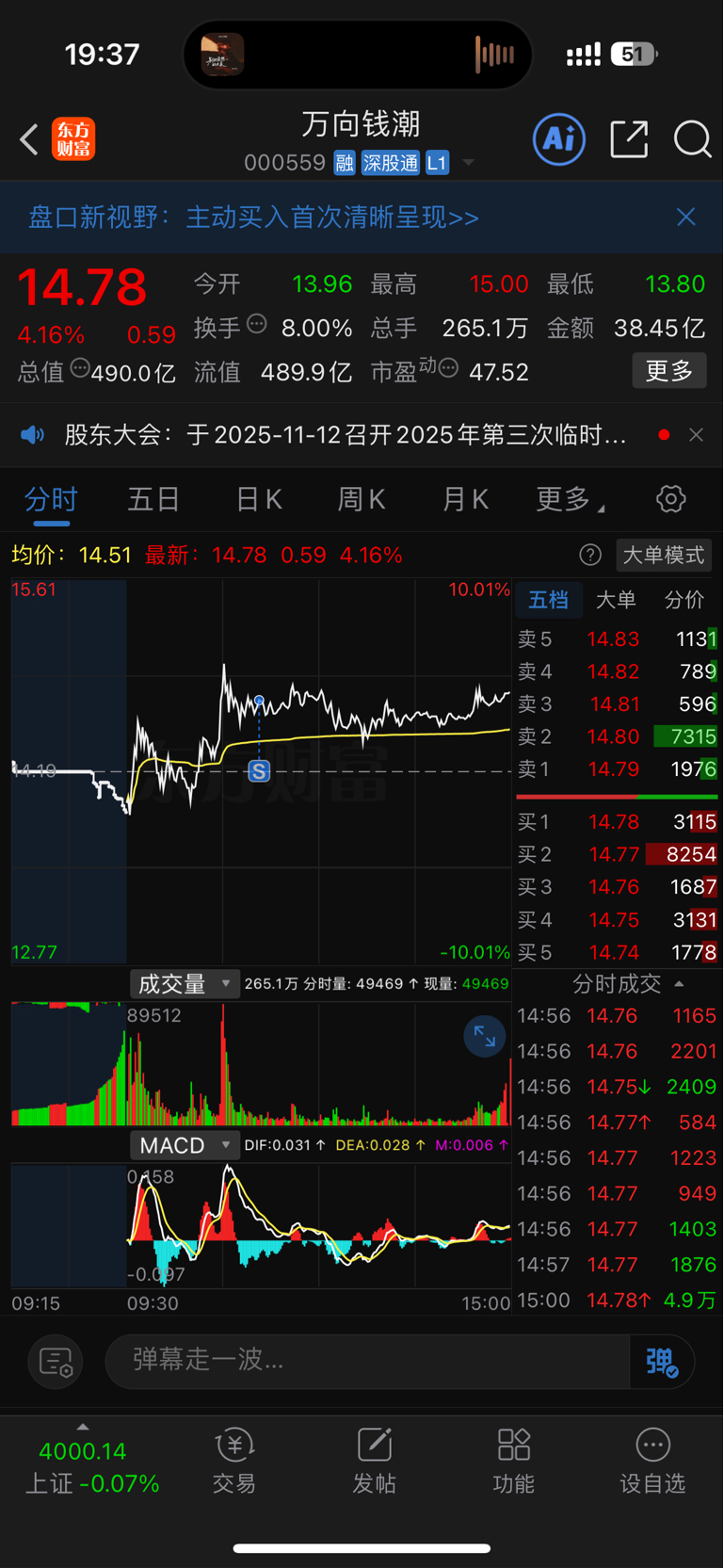 $万向钱潮(SZ000559)$ 特大利好我卖了