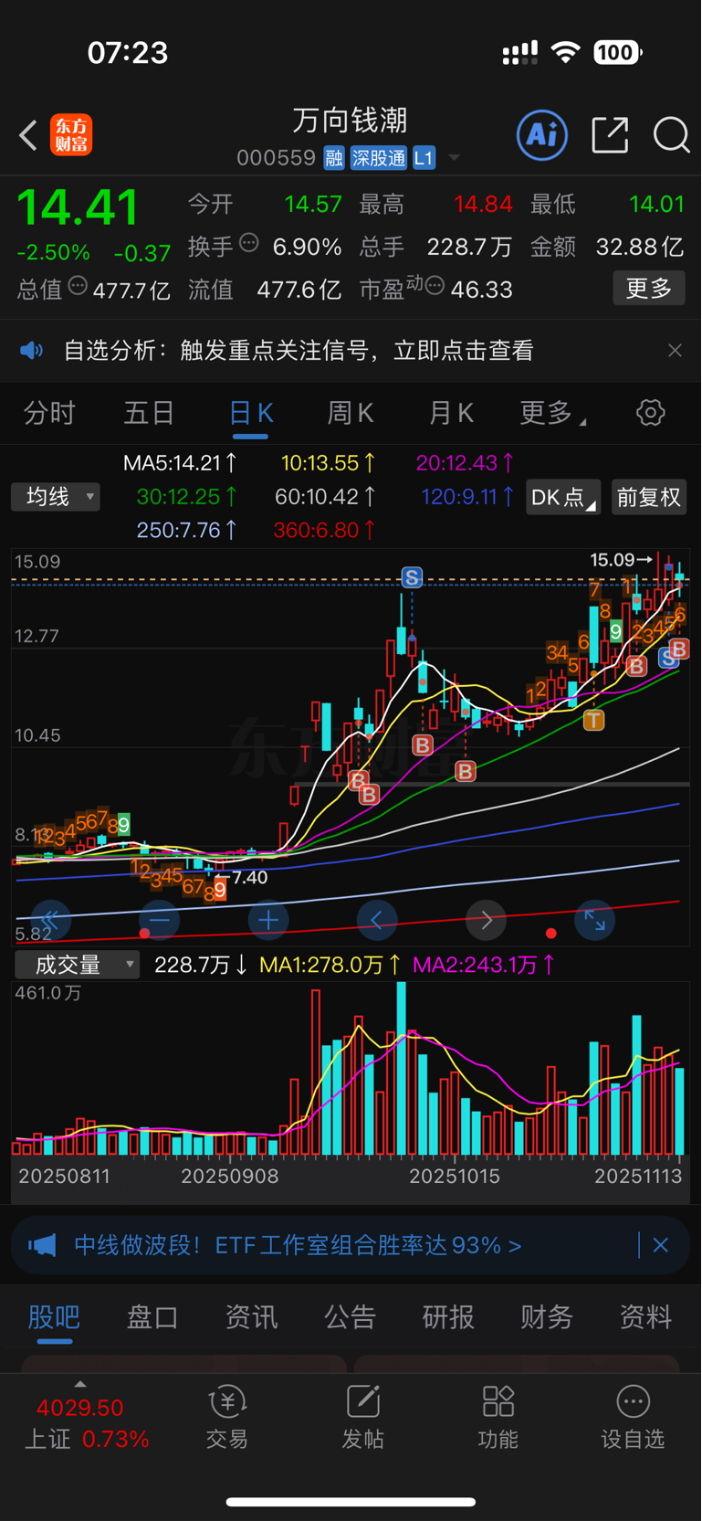 我这个万向脏东西发一下言成本7块左右,今天大概率跌。中长期看好封低加