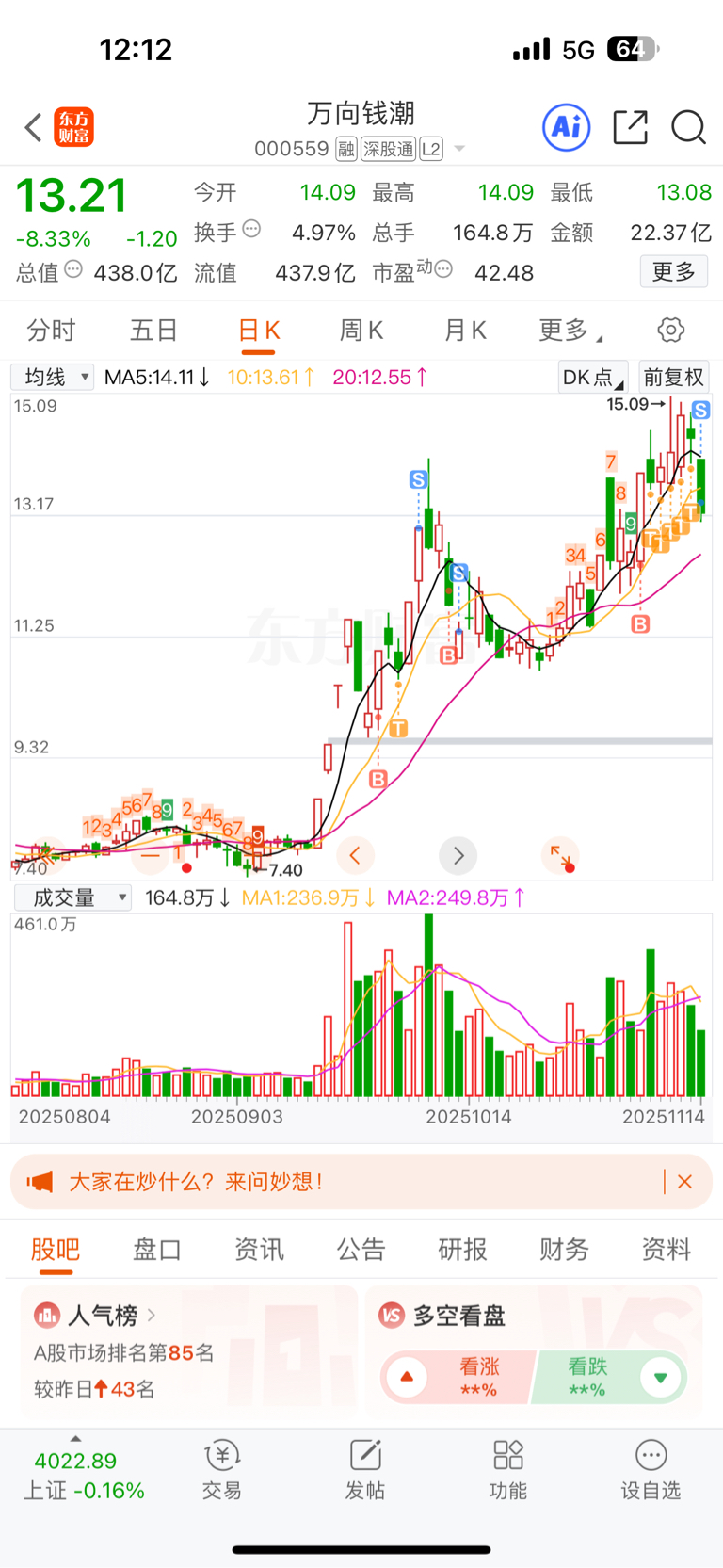 $万向钱潮(SZ000559)$ 感谢主力,不及预期,止盈离场。