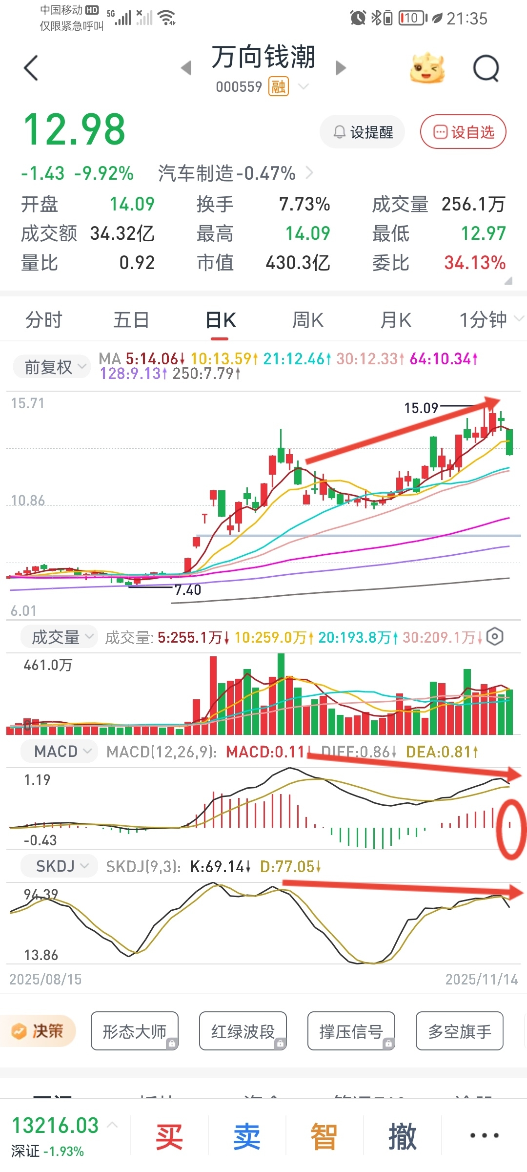 $万向钱潮(SZ000559)$ 下周出绿柱就日线顶背离了