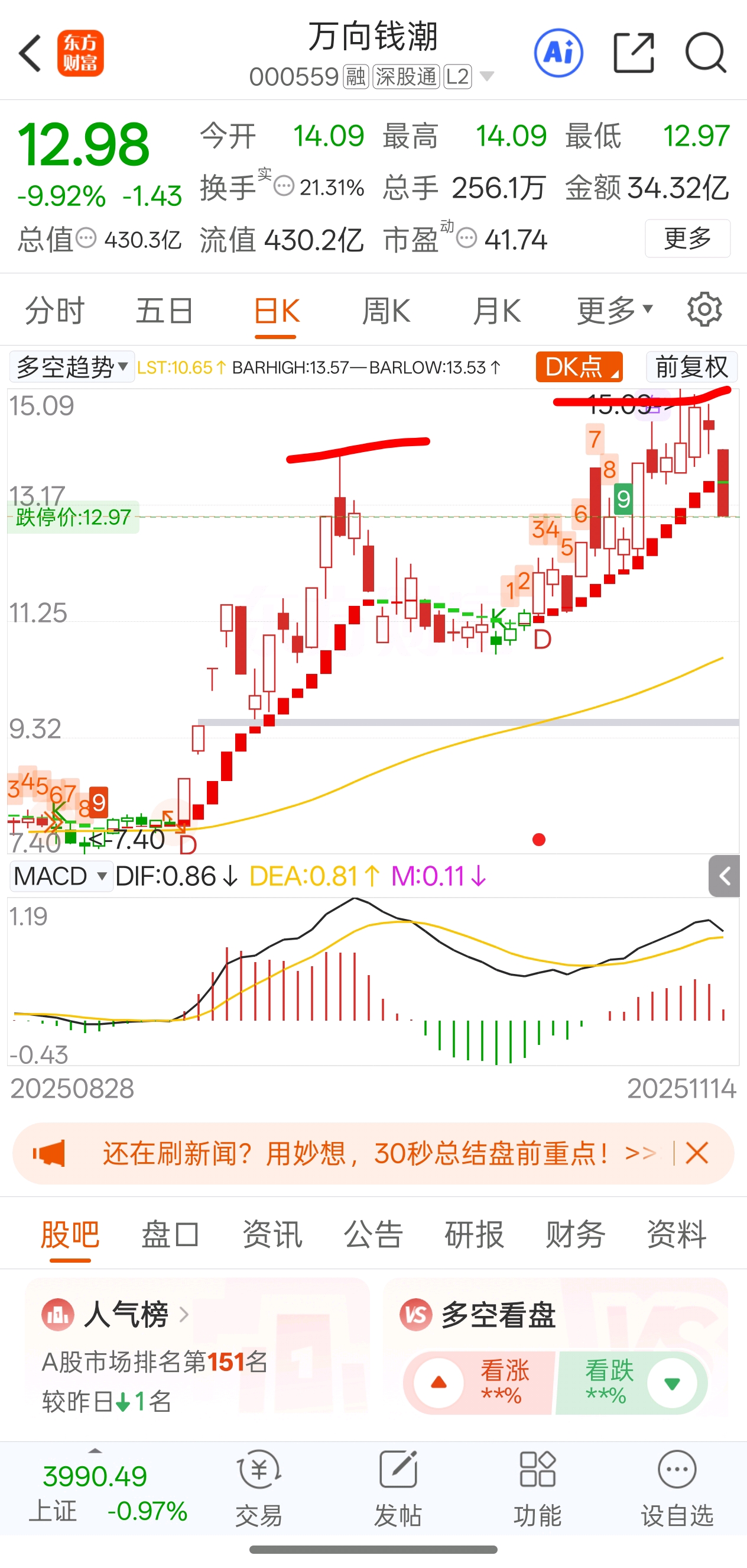 $万向钱潮(SZ000559)$ 虽然我早就跑了,但依旧看好走第三波,等回调结束大概下星期一可以建仓