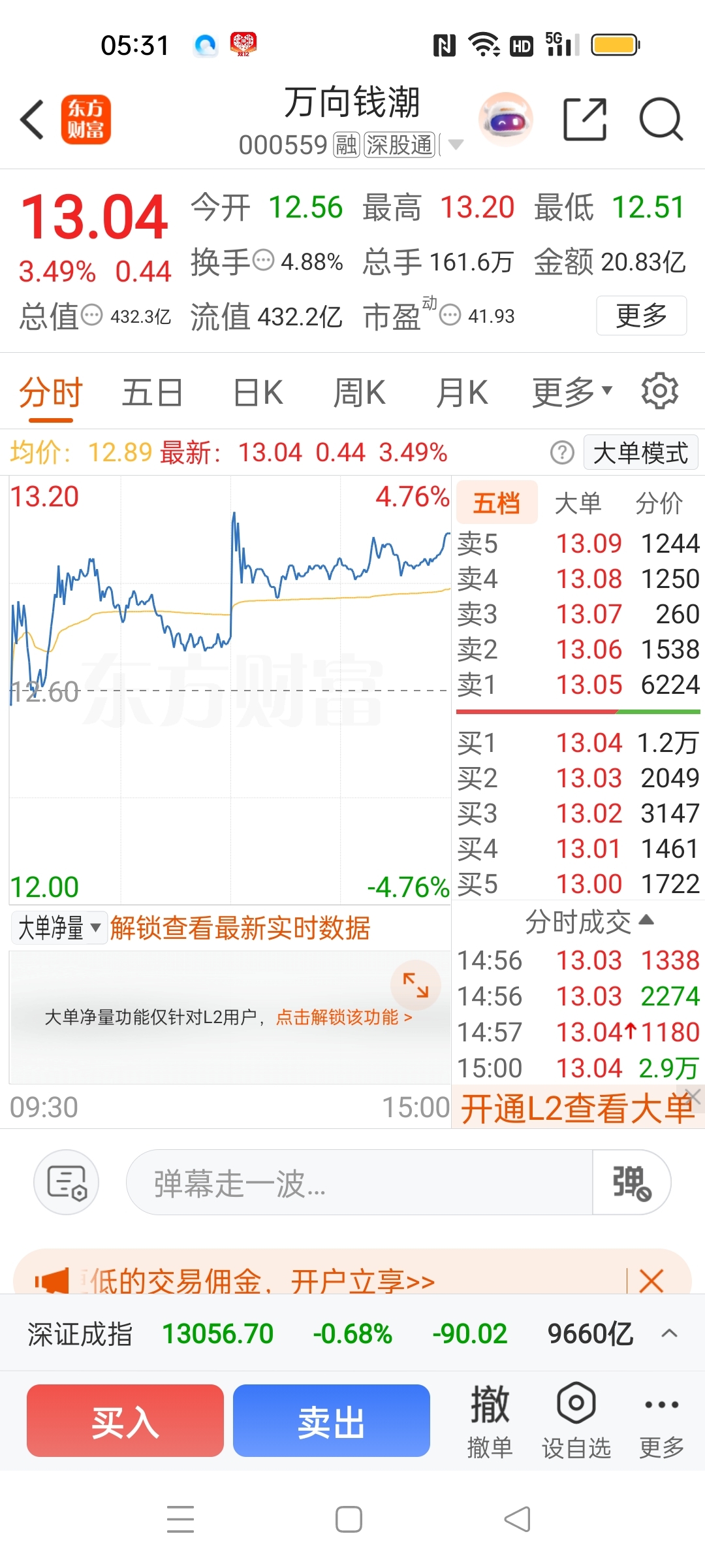 $万向钱潮(SZ000559)$ 今天空仓的没机会了。昨天收盘时有1.2万手买单都没挤进去了。昨天主力净流入2.8亿。今天虽然大盘调整,万哥应该会逆势上涨。