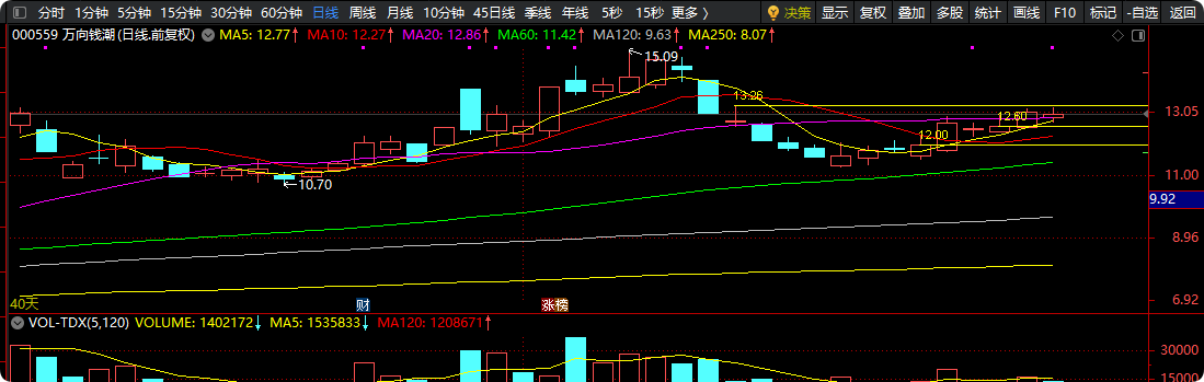 $万向钱潮$,12月3日13.24最高,11月17日最高13.26上方套牢盘希望