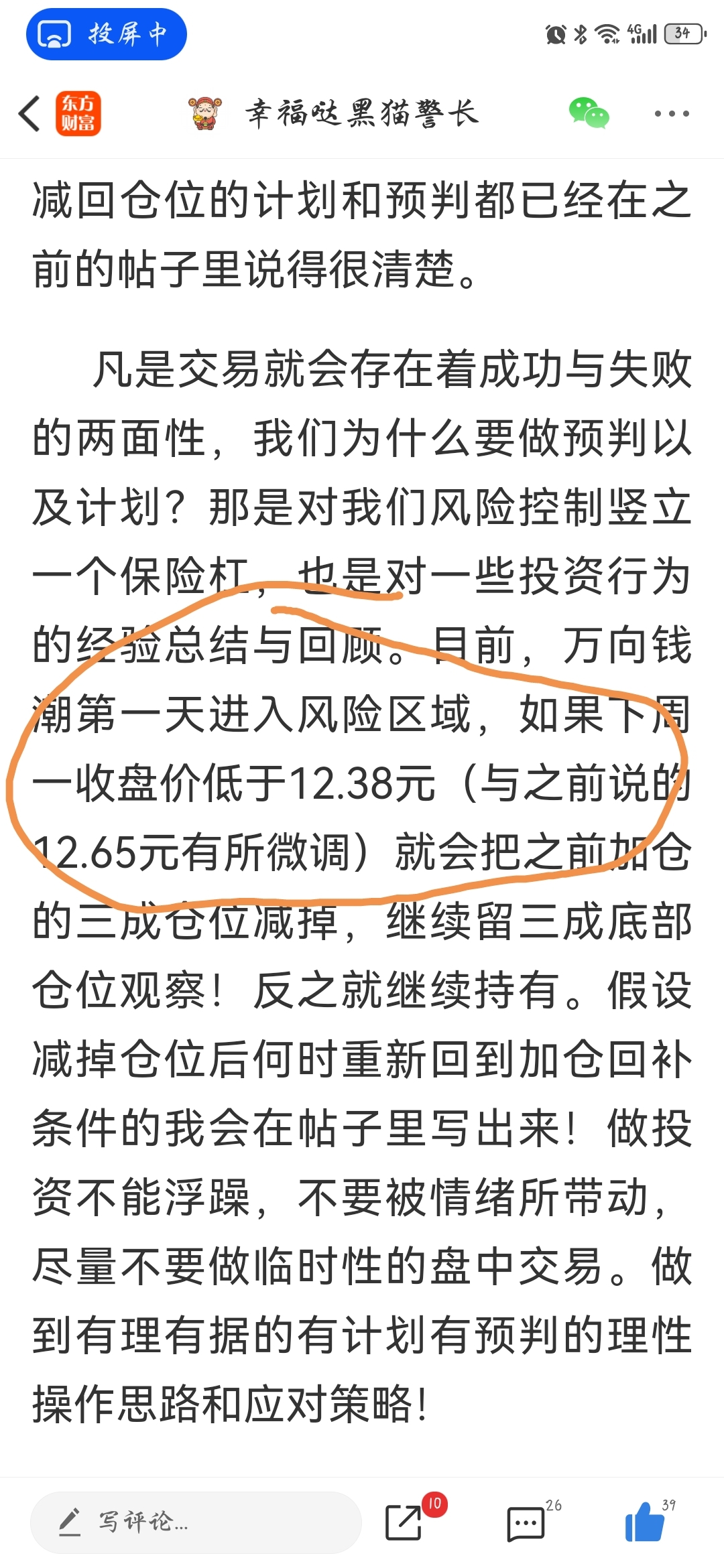 上图是我在上周对于万向钱潮以及一些板块的预判和操作计划!万向钱潮没有符合确认风险区域的条件,因此,继续持仓观察。但后市需要密切留意收盘价。因为离我以及设立的12.35元风险区域比较相近,因此,仍有进入风险区域的机会。另外,我多次强调的无论在大盘指数下跌调整以及上涨的时候唯一能够处于安全买入的板块就是保险券商板块。每一次大跌我都会加仓券商,例如我持有的国泰海通,东吴证券,长江证券。新华保险。上周五我又继续加仓了国泰海通。目前处于低估值的券商保险板块是非常安全的,目前没有卖出计划。这些品种持股过年非常安心!