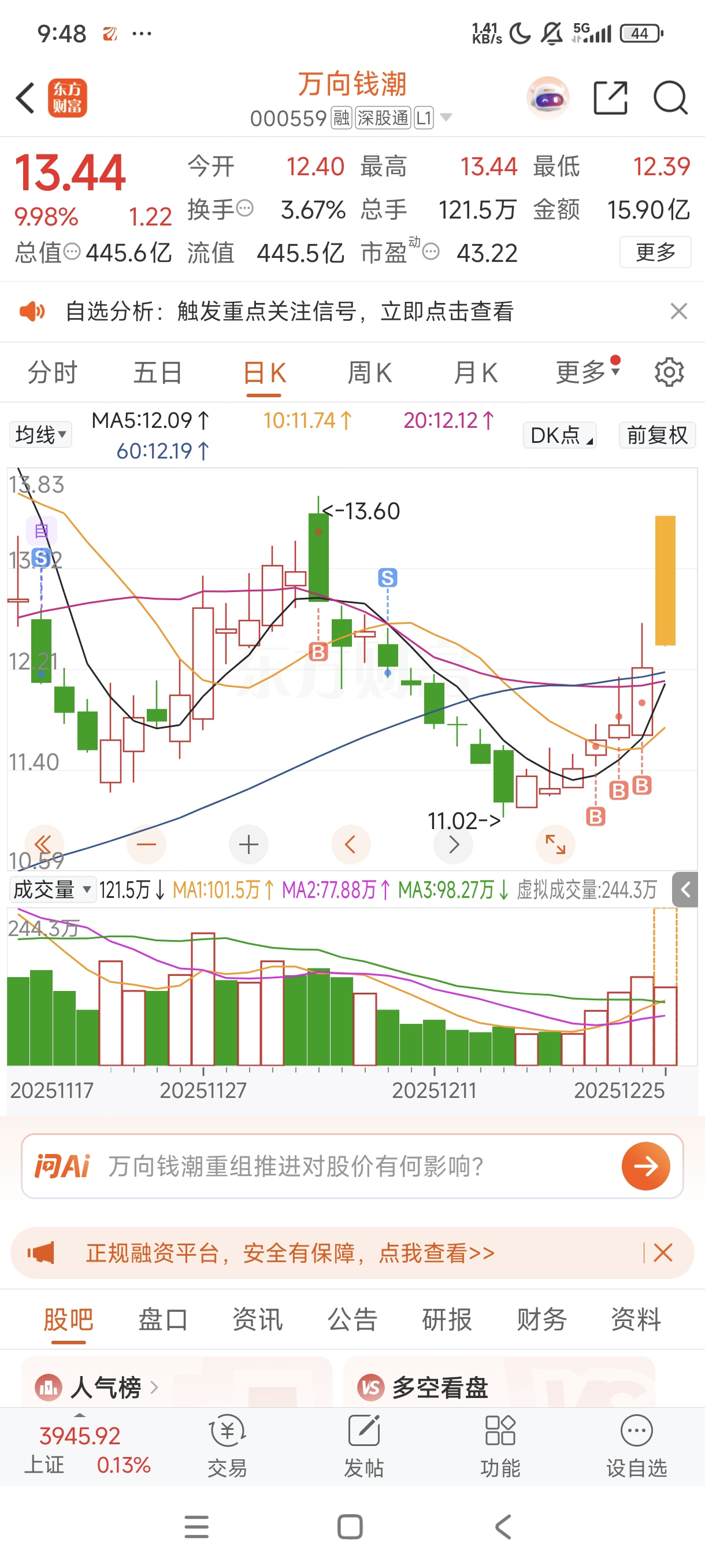 $万向钱潮(SZ000559)$ 哪里跌倒在哪里爬起来,亏了我两万,目前回血6000